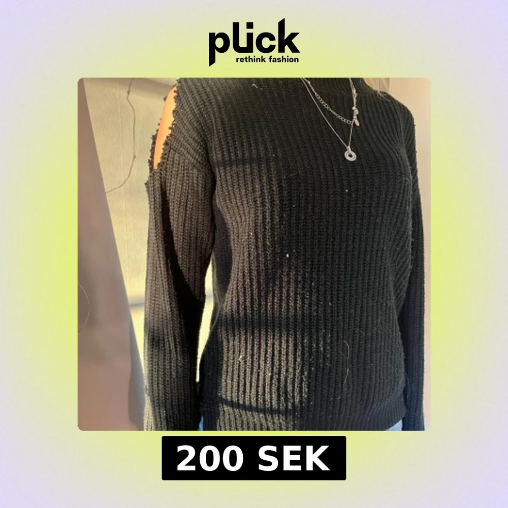 Snygg svart stickad tröja med unika öppna axlar. Perfekt för att ge en stilren look med en twist. Tröjan har långa ärmar och en ribbad struktur som ger en skön passform.