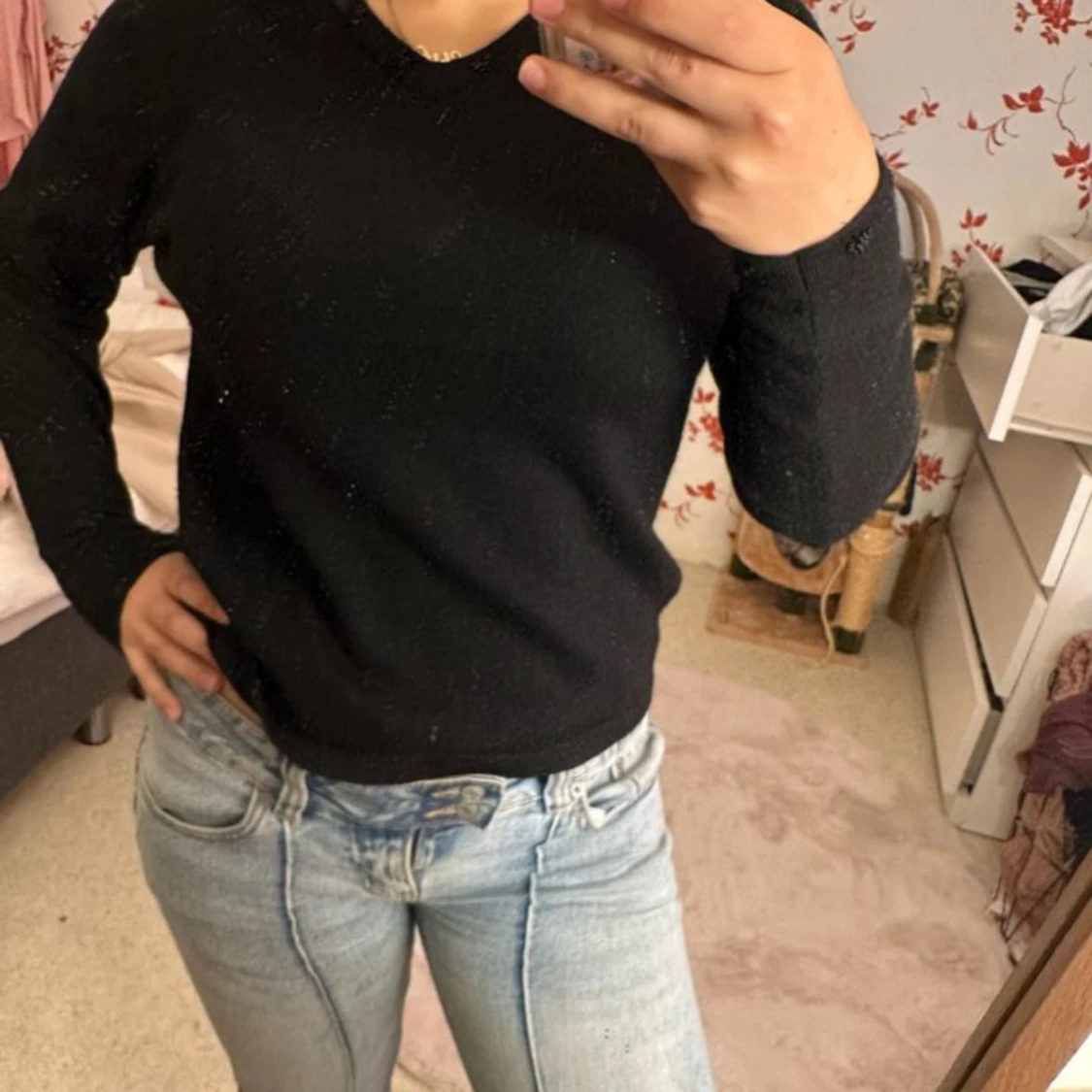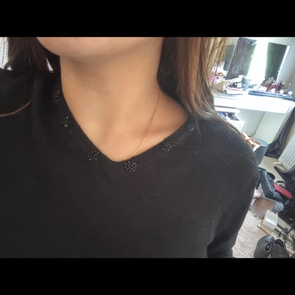 Svart stickad tröja med v-ringning och små svarta pärldetaljer runt halsringningen och vid ärmsluten. Långärmad och i mjukt material som känns skönt mot huden. Enkel men ändå med en snygg twist tack vare pärlorna.