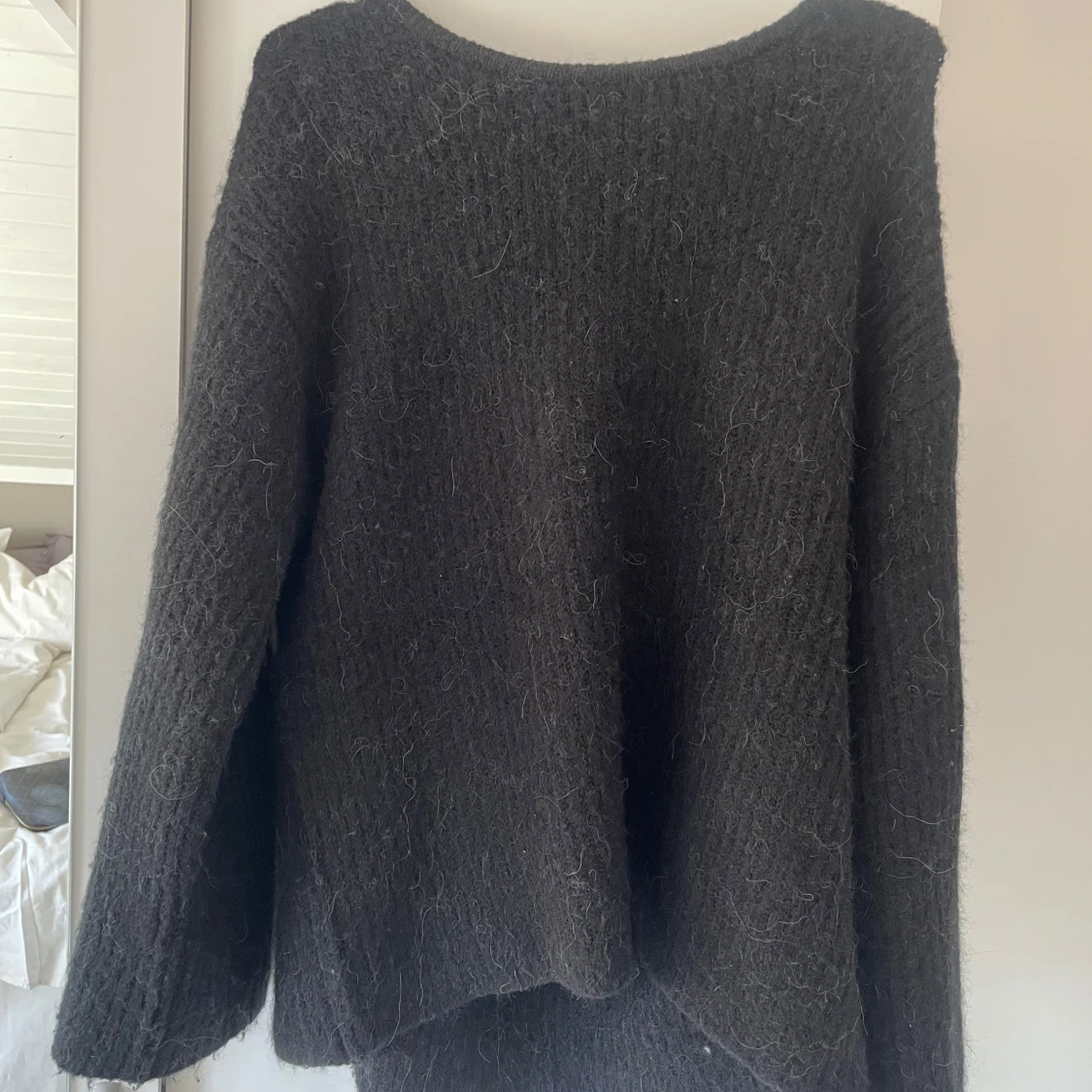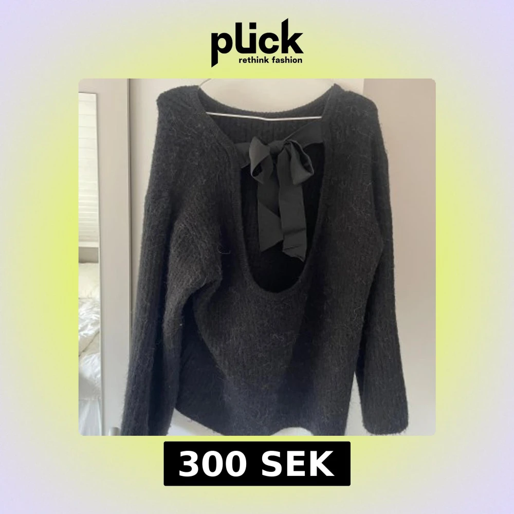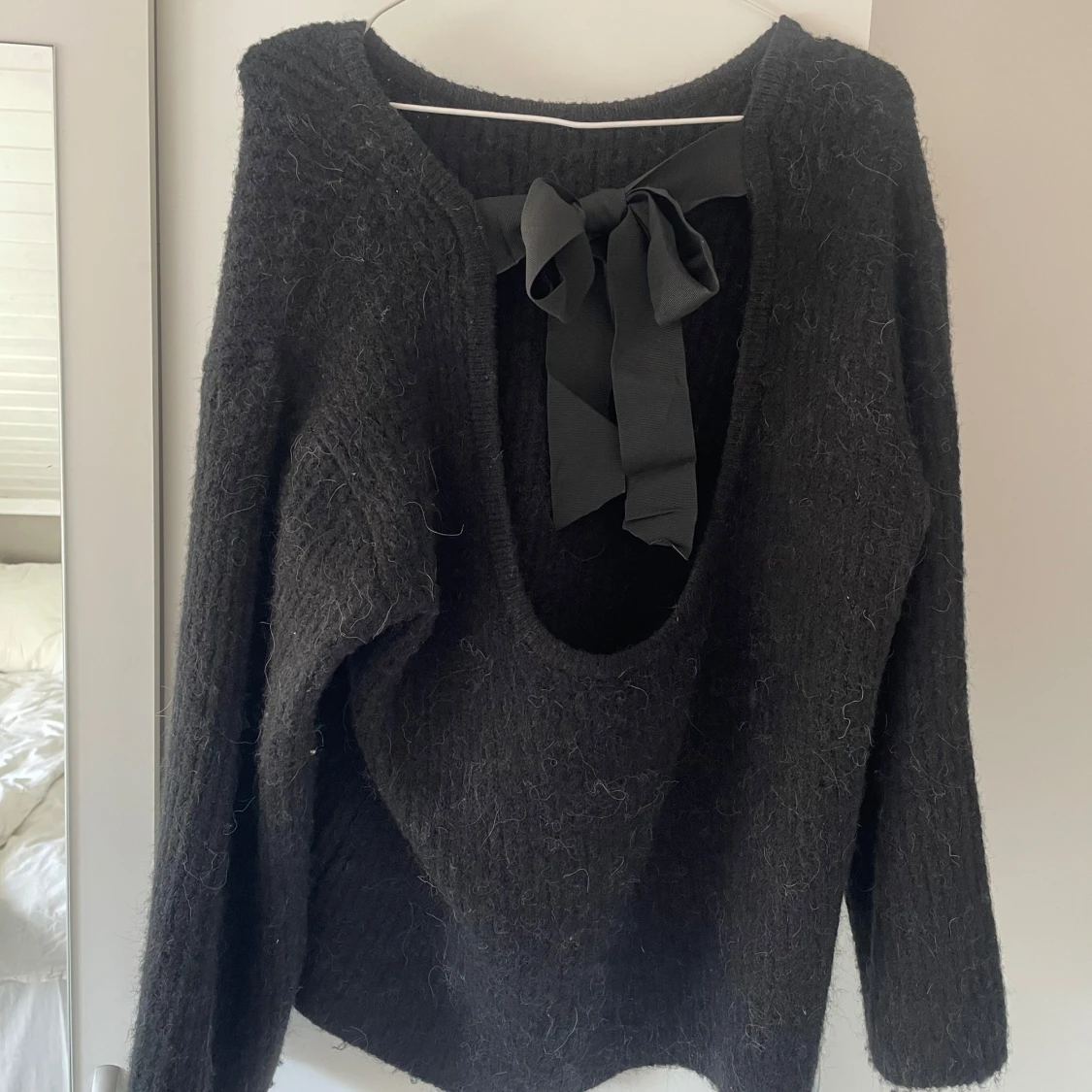 Mysig svart stickad tröja med lång ärm och stor, djup urringning i ryggen med en rosett. Använd fåtal tillfällen men tyvärr kommer den inte till användning för mig längre.