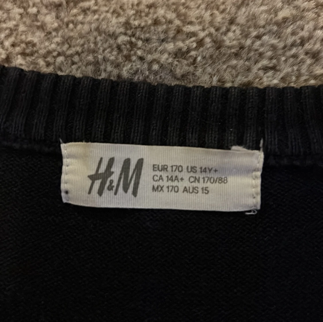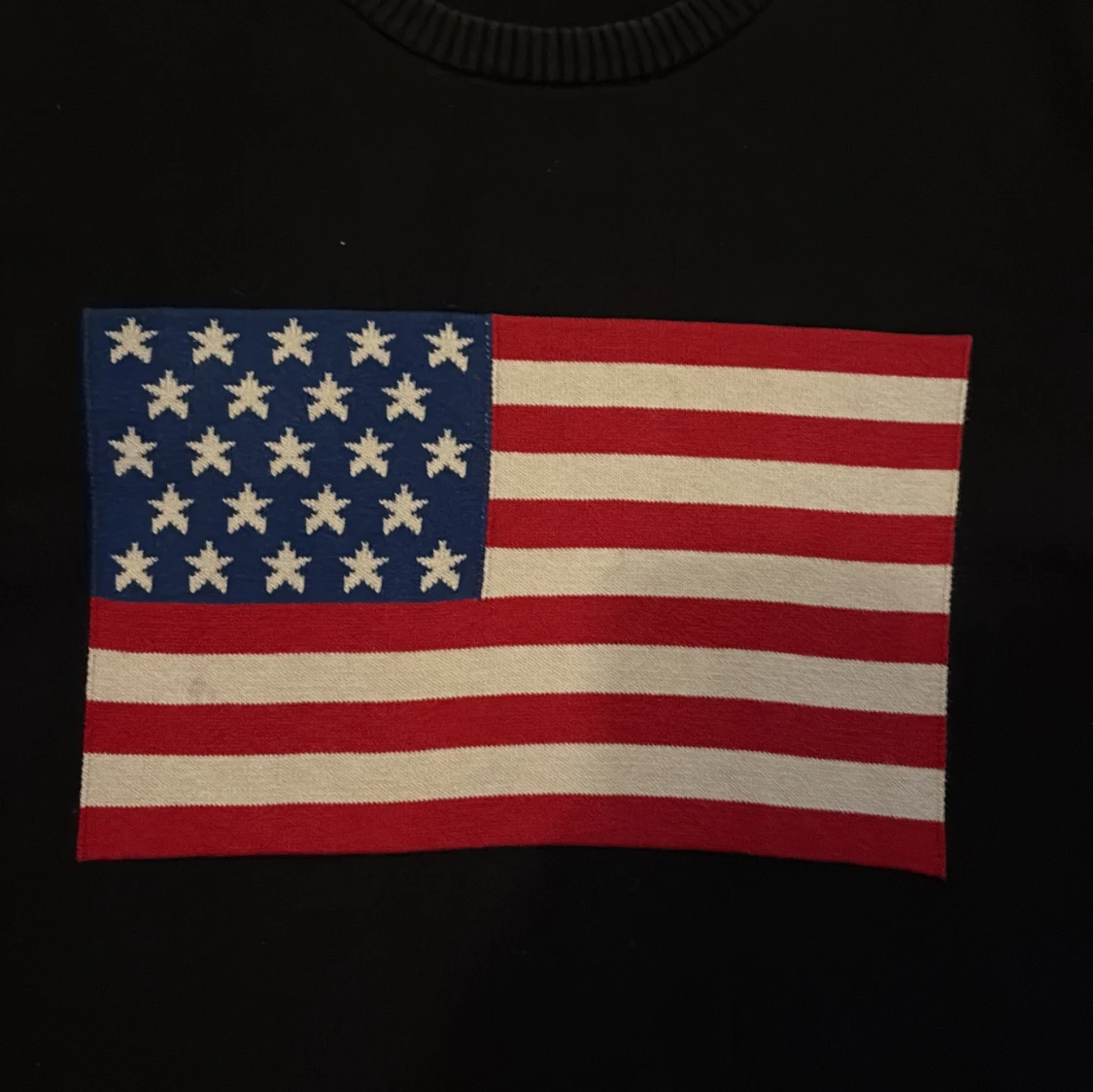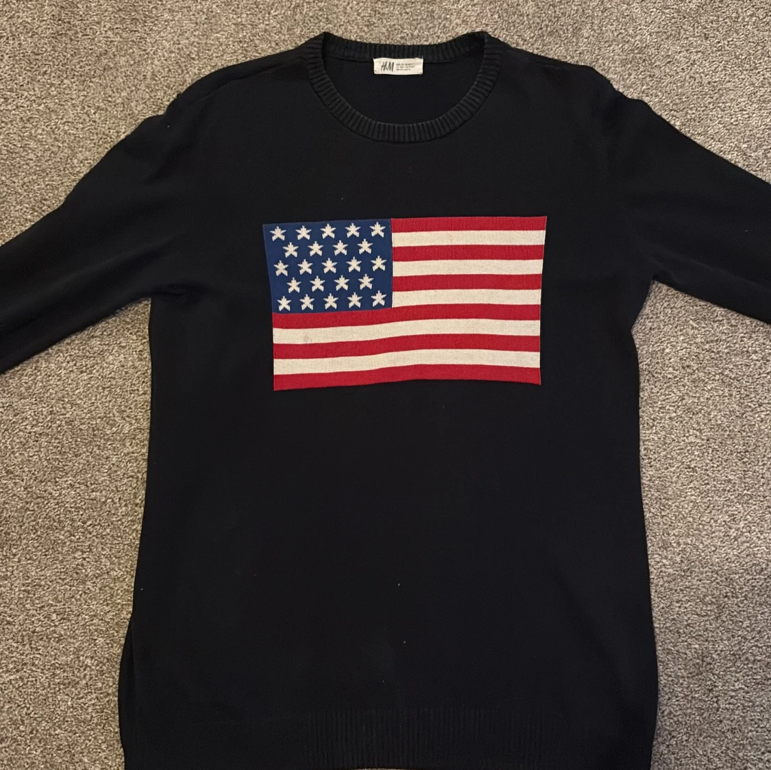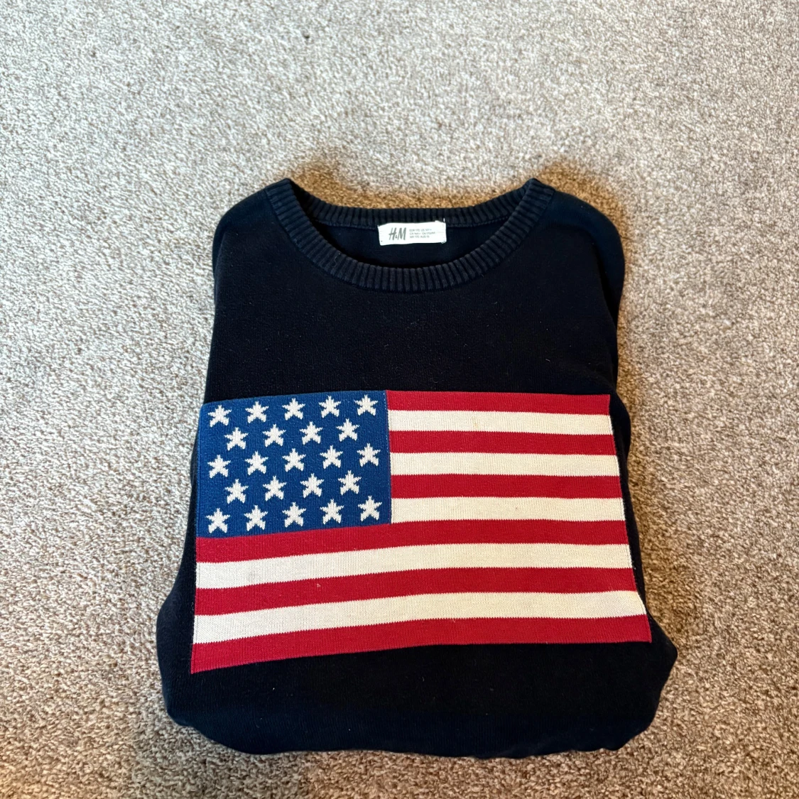 Svart stickad tröja från H&M i storlek 170. Framsidan har en stor, färgglad USA-flagga i blått, rött och vitt. Tröjan har rund halsringning och långa ärmar.