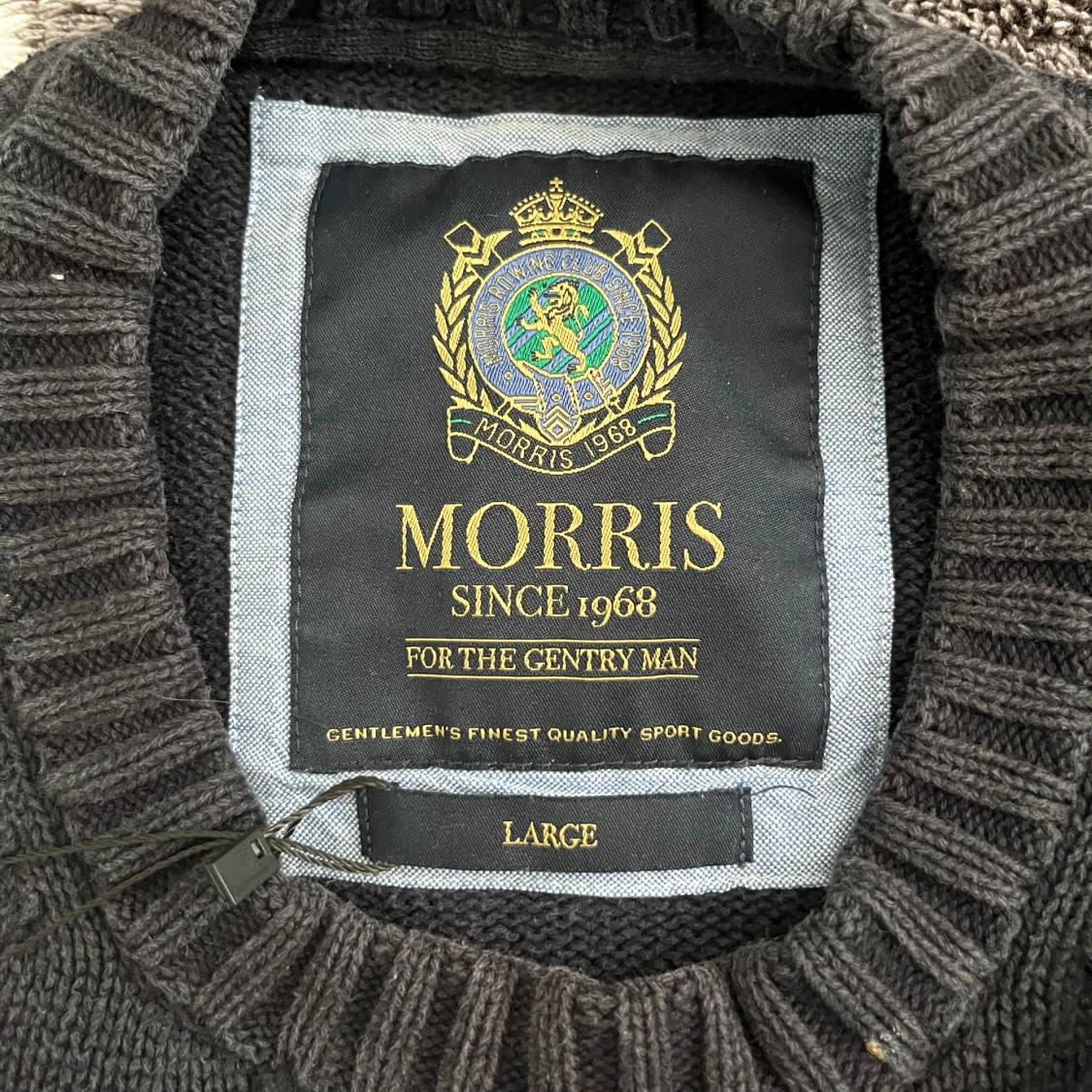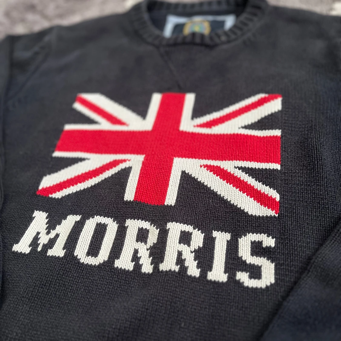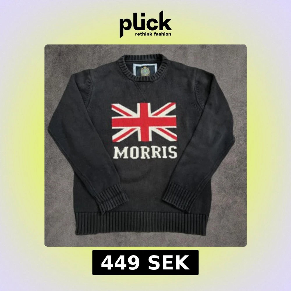 Svart stickad tröja från Morris i storlek Large med Union Jack-flagga och Morris-logga på bröstet. Tröjan har rund hals, ribbade muddar och nederkant. Materialet är mjukt och skönt, perfekt för kyliga dagar. Snygg och klassisk design med brittisk touch.
