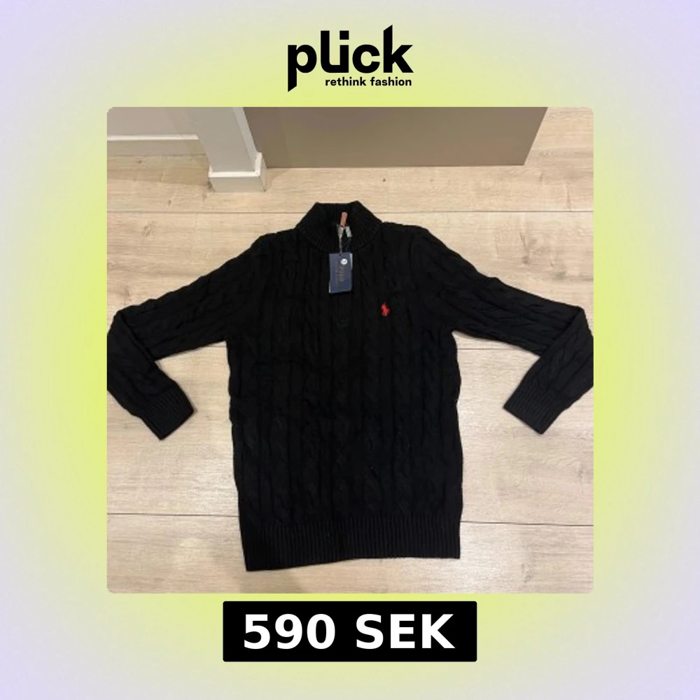 Svart kabelstickad tröja från Polo Ralph Lauren med halv dragkedja och hög krage. Klassisk röd logga broderad på bröstet. Tröjan är långärmad och har ribbade muddar och nederkant. Perfekt för dig som gillar stilren och tidlös design.