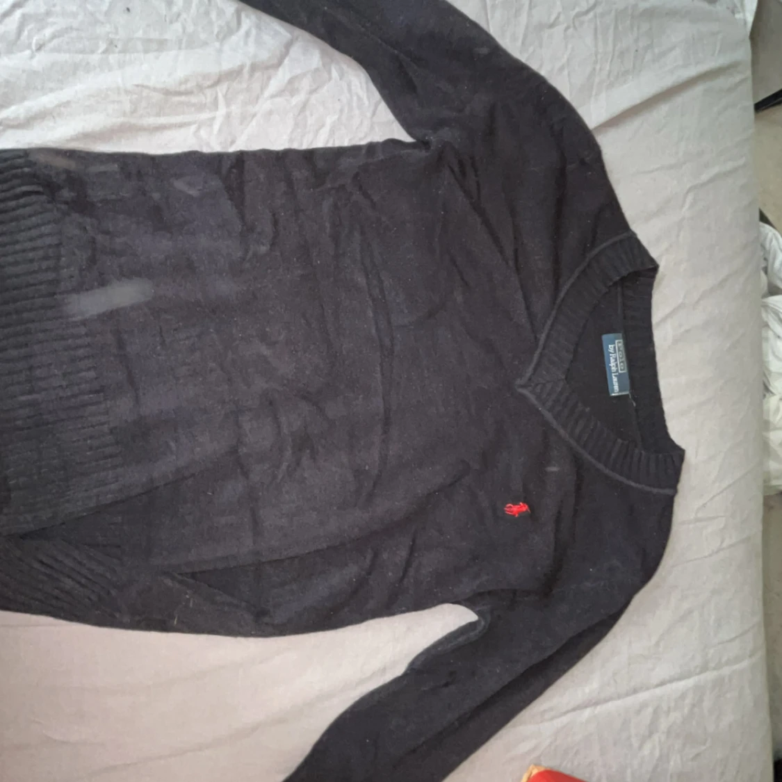 Svart stickad tröja från Polo Ralph Lauren med röd broderad logga på bröstet. V-ringad hals och ribbade muddar vid ärmslut och nederkant. Perfekt för dig som gillar klassisk stil med en touch av street. Passar dig som vill ha en enkel men snygg look.