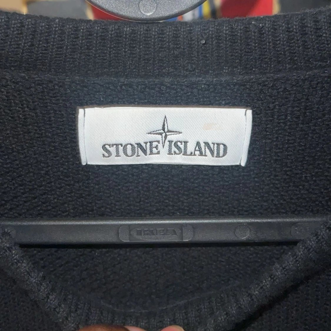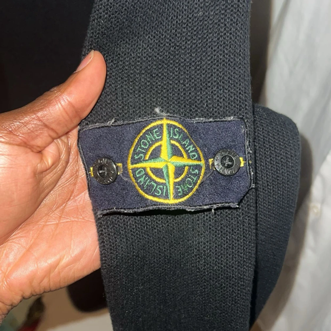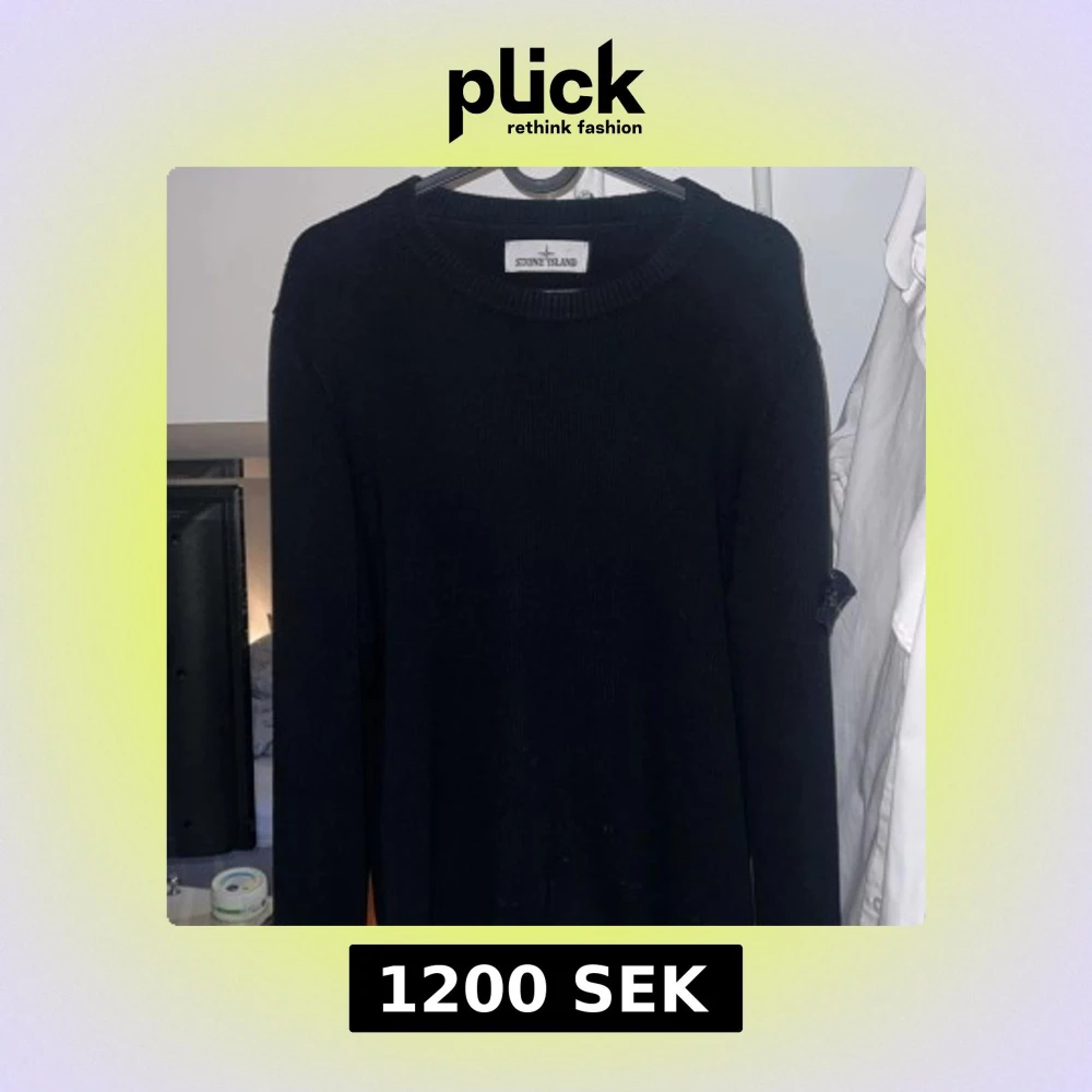 Svart stickad tröja från Stone Island i storlek S. Klassisk rund hals och långärmad modell med den ikoniska Stone Island patchen på ärmen. Tröjan har en clean look och är perfekt för dig som gillar streetwear och snygga detaljer.