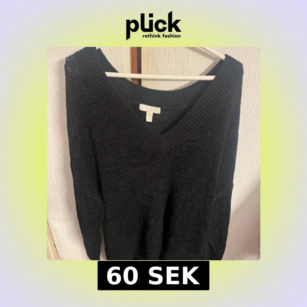 Mysig svart stickad tröja från H&M med djup v-ringning och långa ärmar. Perfekt för lager-på-lager och enkel att matcha till olika outfits. Klassisk modell med bred ribbad kant vid halsen.