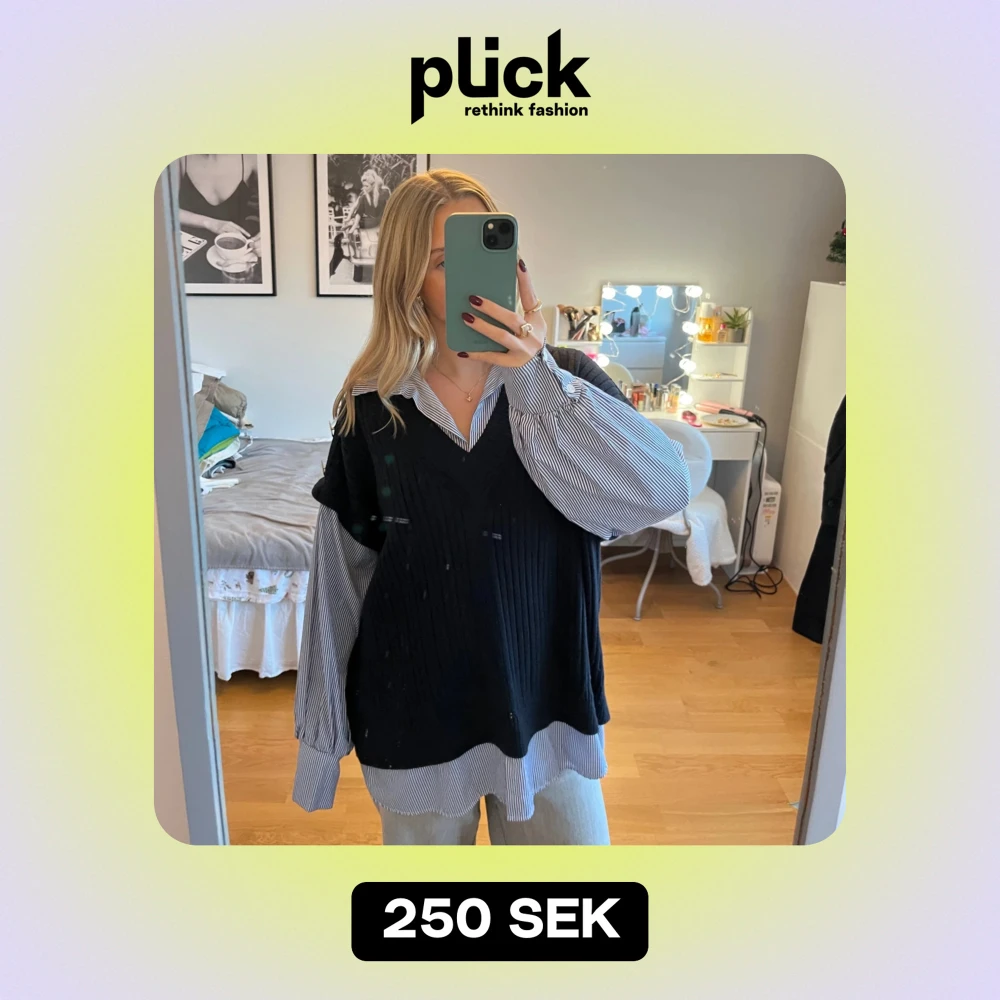 Snygg svart stickad väst från River Island, perfekt för lager-på-lager-stil. Den har en ribbad struktur och är kombinerad med en randig skjorta under för en trendig look. Passar utmärkt till både vardag och mer uppklädda tillfällen.