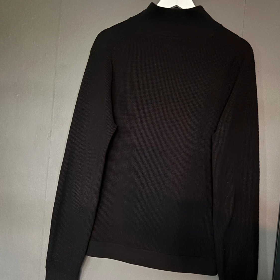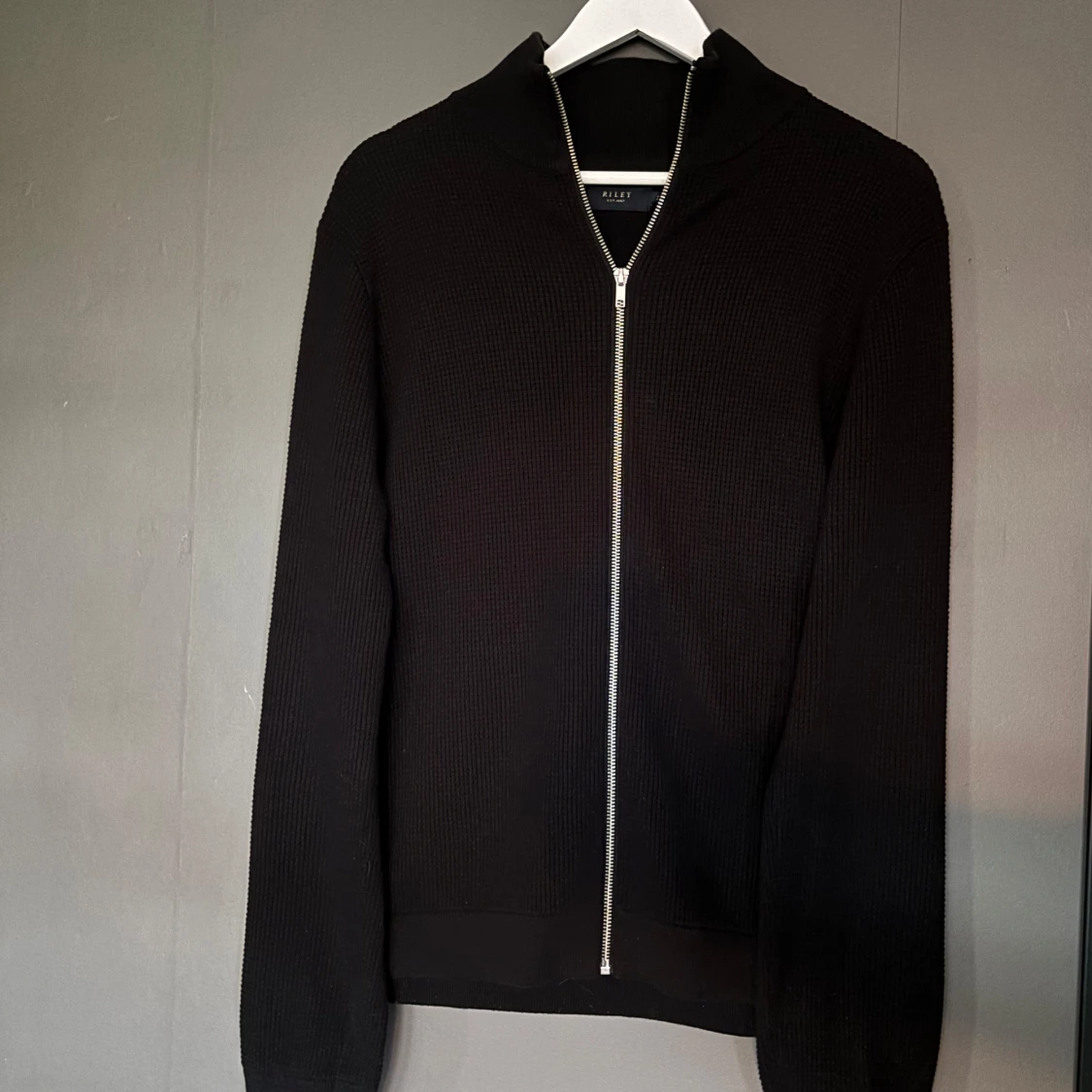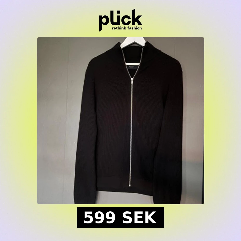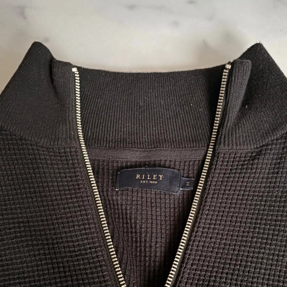 Säljer en svart stickad tröja från Riley med hel dragkedja framtill. Tröjan har lång ärm och en stilren, ribbad struktur. Perfekt för lager-på-lager och enkel att matcha med olika outfits.