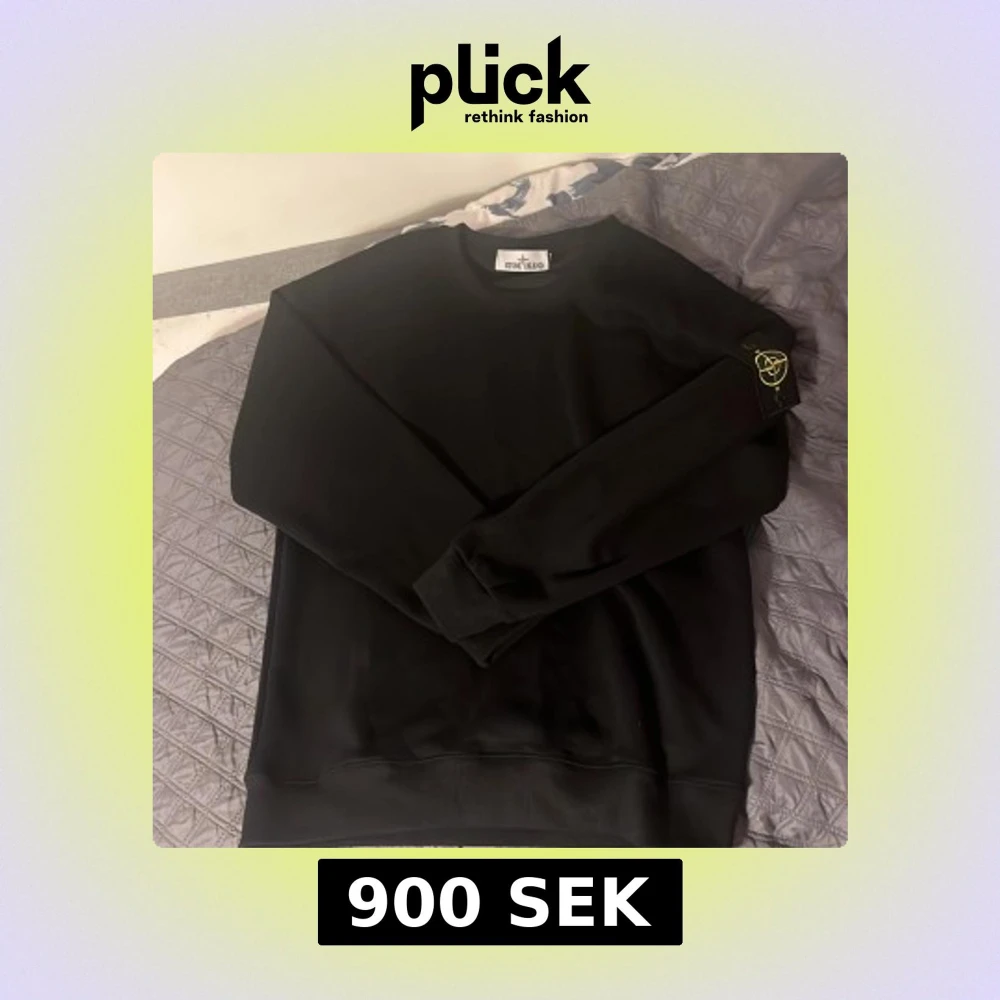 Svart sweatshirt från Stone Island i storlek M. Klassisk rund hals och ribbade muddar. Ikonisk logopatch på vänster ärm. Tröjan har en clean och stilren look, perfekt för dig som gillar streetwear och vill ha något som sticker ut lite extra.