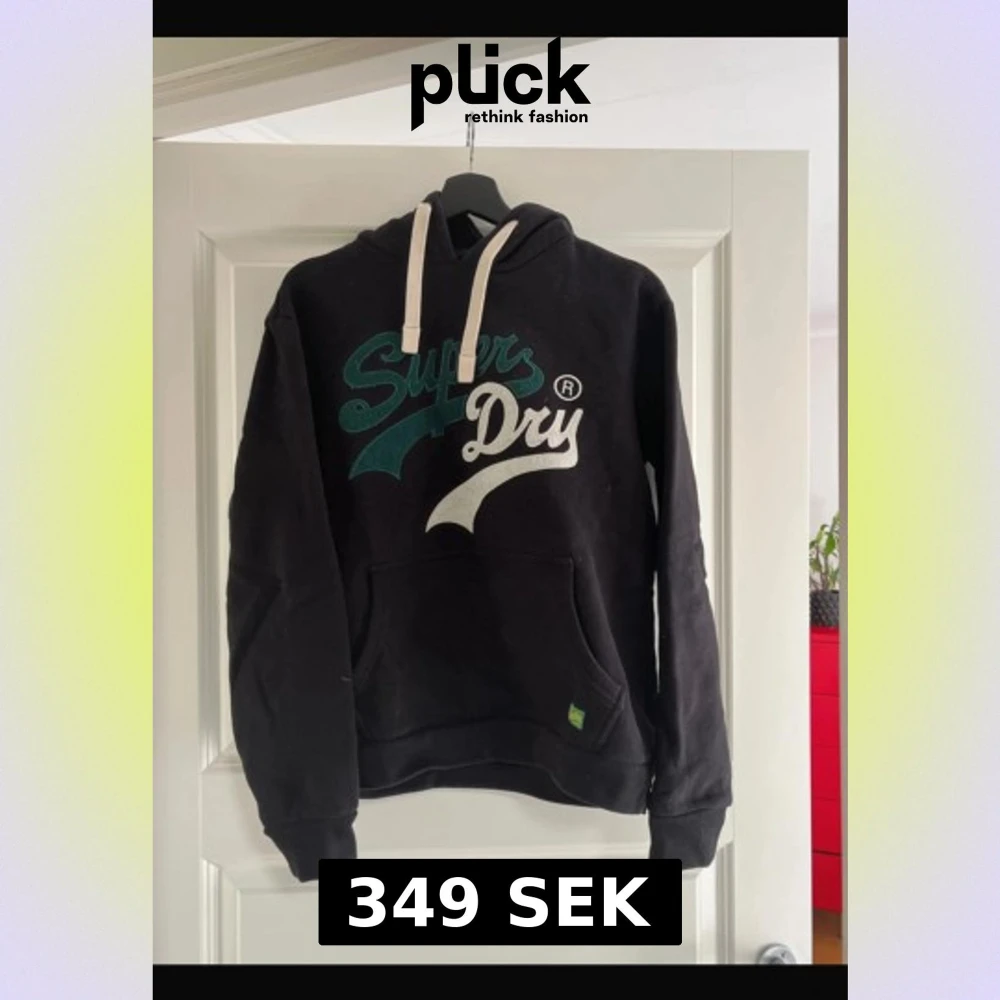Svart hoodie från Superdry i storlek M med stort broderat logotryck i grönt och vitt på bröstet. Tröjan har huva med vita snören och en klassisk magficka. Materialet är mjuk bomull och polyester, perfekt för chill dagar.