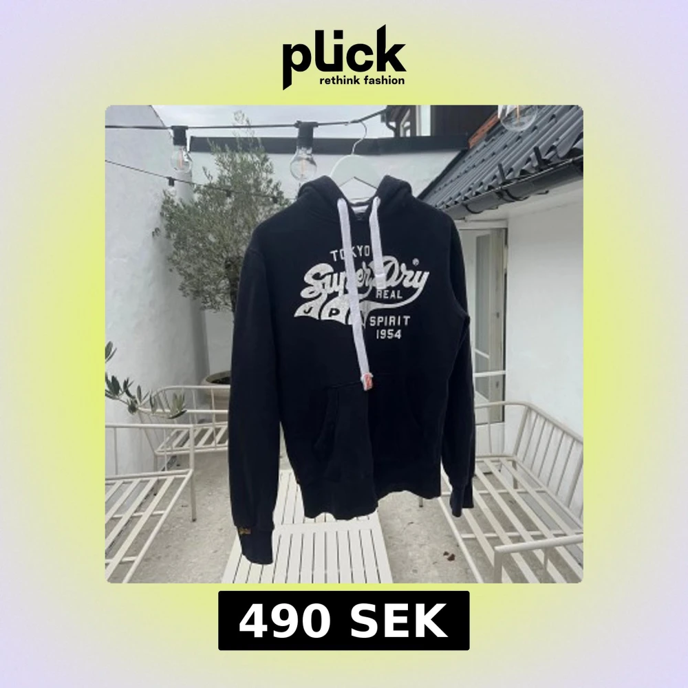 Svart hoodie från Superdry med stor vit logga och text på bröstet. Tröjan har huva med vita snören, känguruficka och ribbade muddar. Perfekt för chill dagar och har en klassisk streetstil. Materialet är mjuk bomull och polyesterblandning.