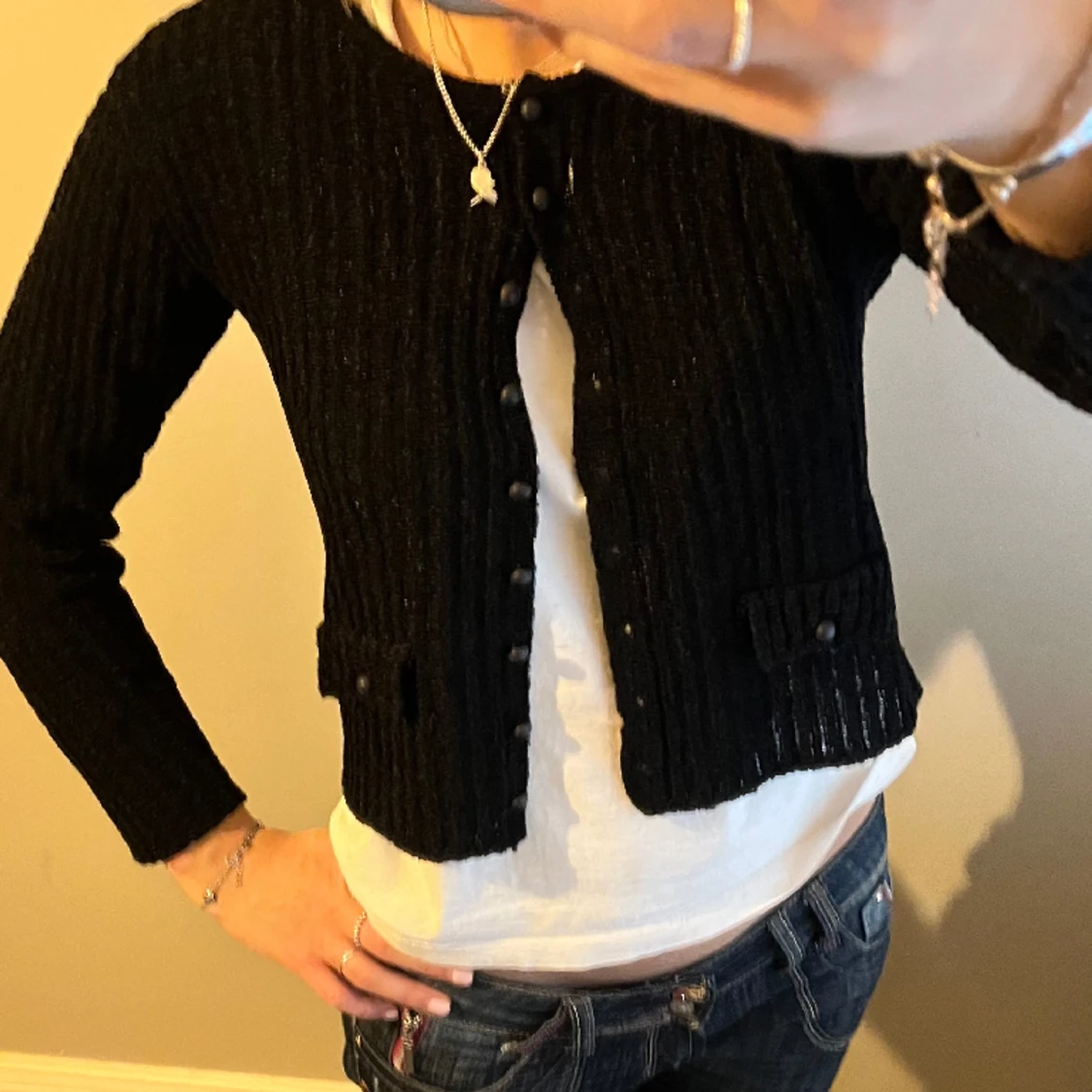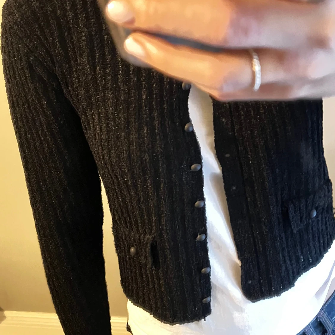 Svart söt stickad kofta som är för liten😇det finns ingen storlek men skulle säga att det är en xs/s