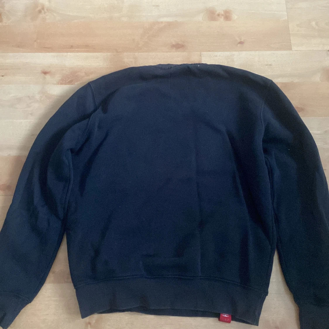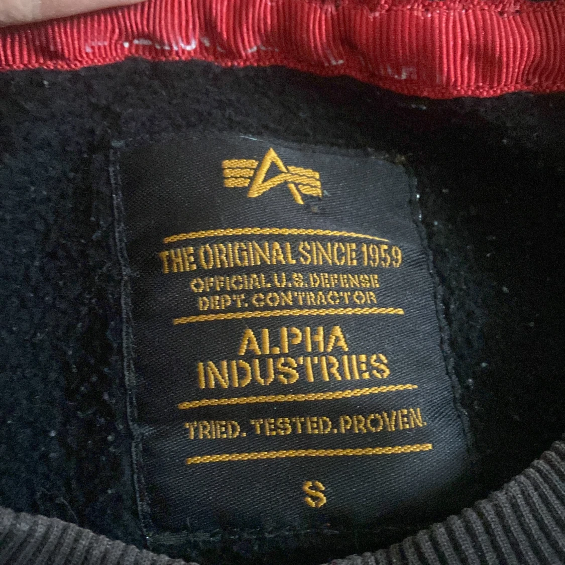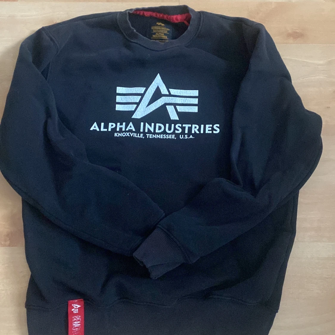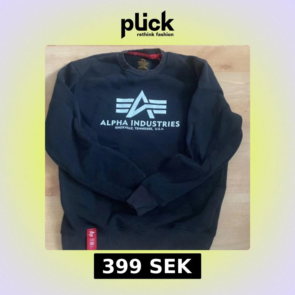 Svart sweatshirt från Alpha Industries i storlek S med stort vitt tryck på bröstet och klassisk rund hals. Tröjan har långa ärmar, ribbade muddar och en röd detalj vid nederkanten. Perfekt för dig som gillar streetwear och snygga loggor.