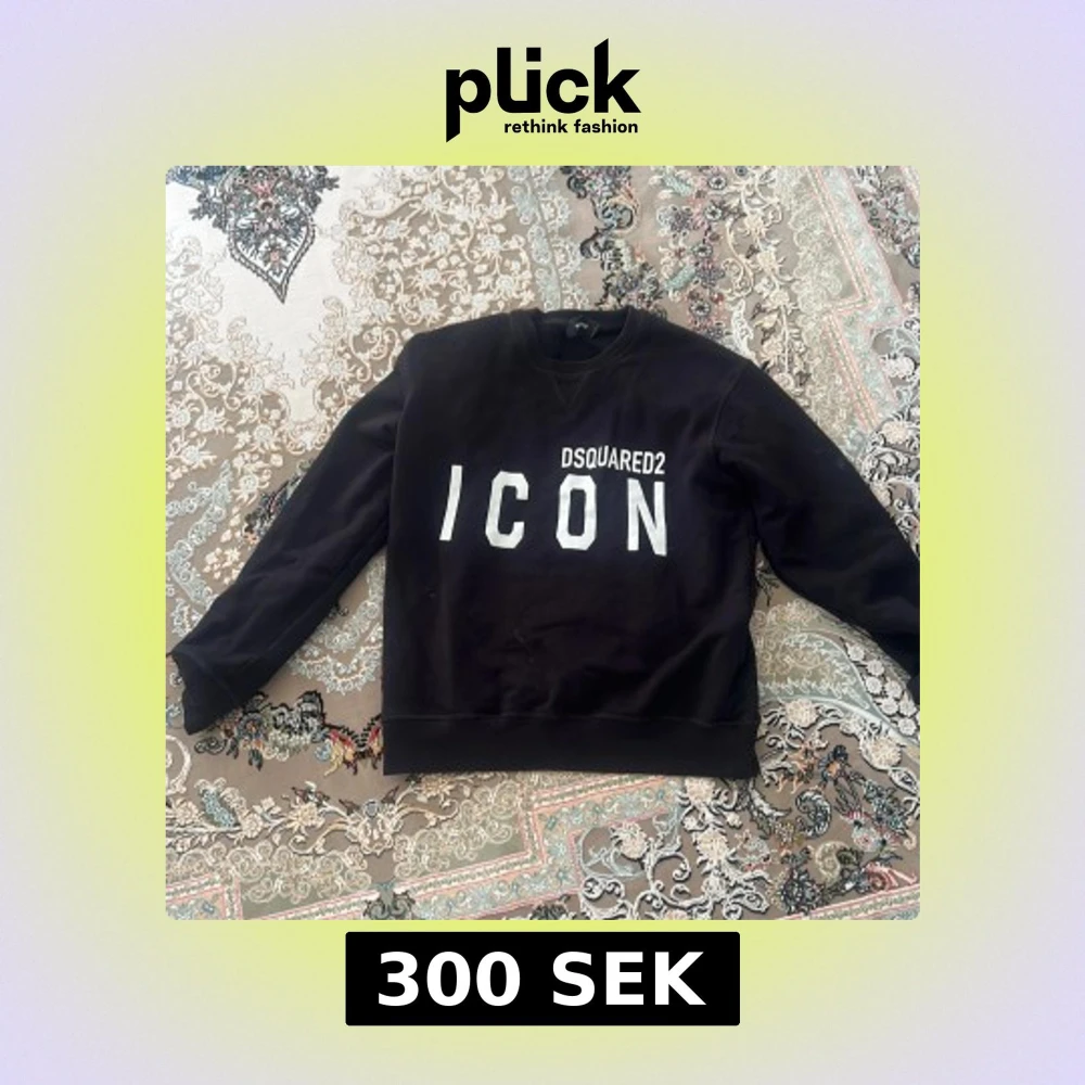 Svart sweatshirt från Dsquared2 i storlek M med stor vit 'ICON'-print på bröstet och Dsquared2-logga. Tröjan har rund hals, långa ärmar och ribbade muddar. Perfekt för dig som gillar streetwear och vill sticka ut med en snygg statement-tröja. Top kvalite