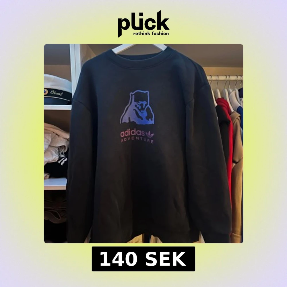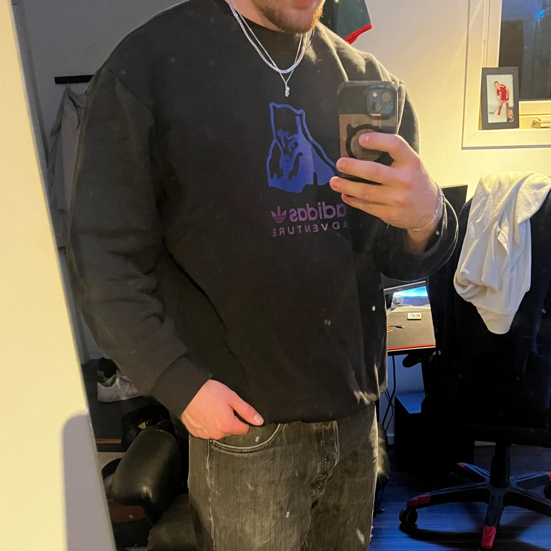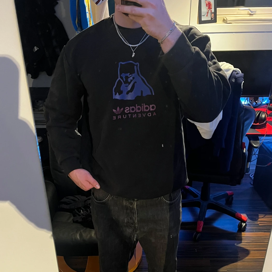 Säljer en svart sweatshirt från Adidas Adventure med tryck av en lila björn och text på bröstet. Tröjan har rund halsringning och långa ärmar. Perfekt för en avslappnad stil.