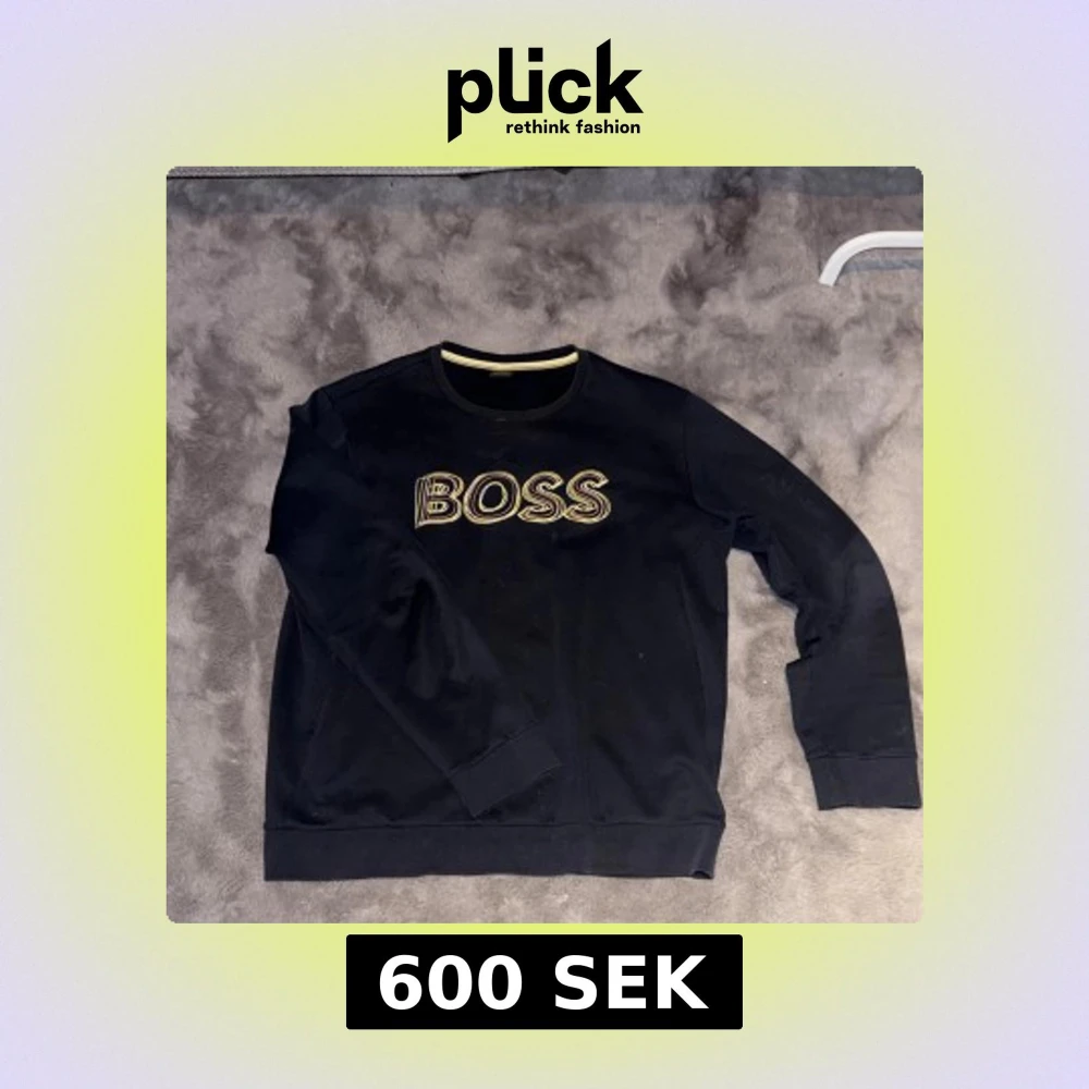 Svart sweatshirt från BOSS med stor broderad logga i gult och vitt på bröstet. Tröjan har rund halsringning med randiga detaljer i kragen och långa ärmar. Perfekt för en stilren och avslappnad look.