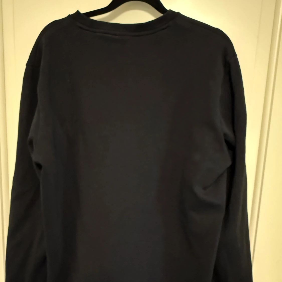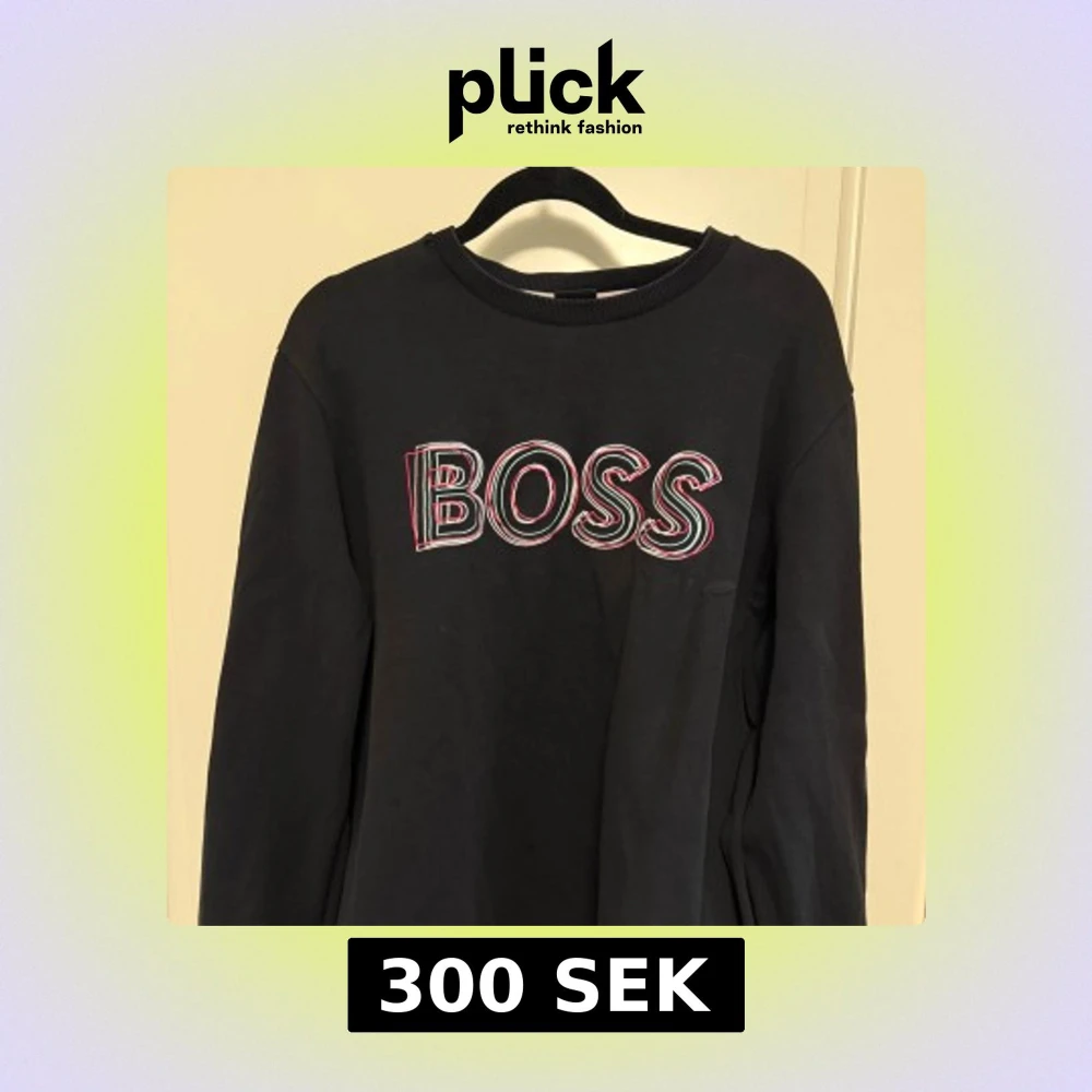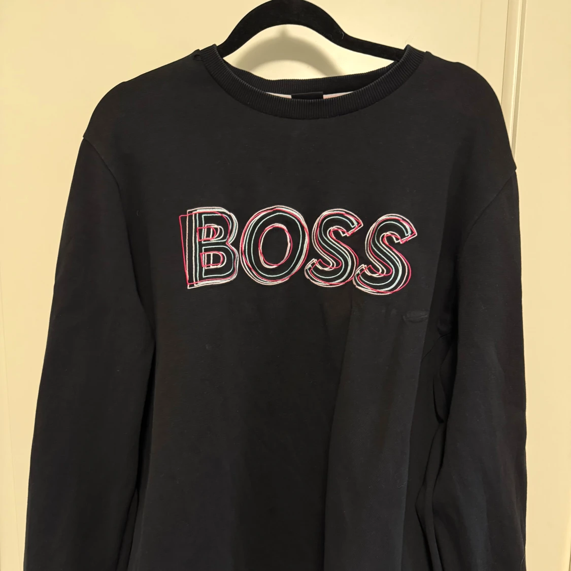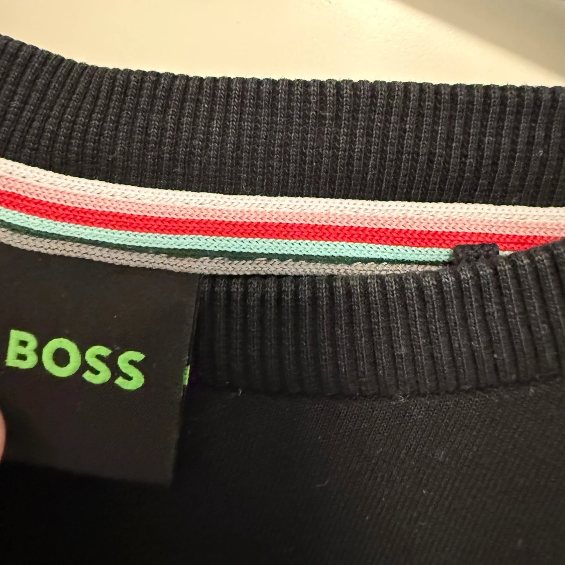 Svart sweatshirt från BOSS med stort, broderat BOSS-tryck i vitt, rött och grönt på bröstet. Rund hals med ribbad kant och färgade ränder i grått, rött och mint. Långärmad och tillverkad i mjuk bomull för skön komfort.
