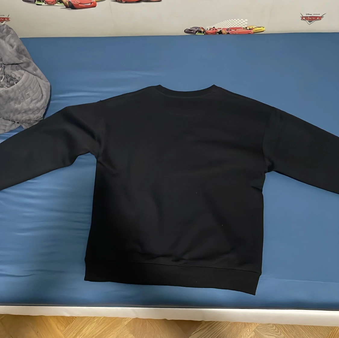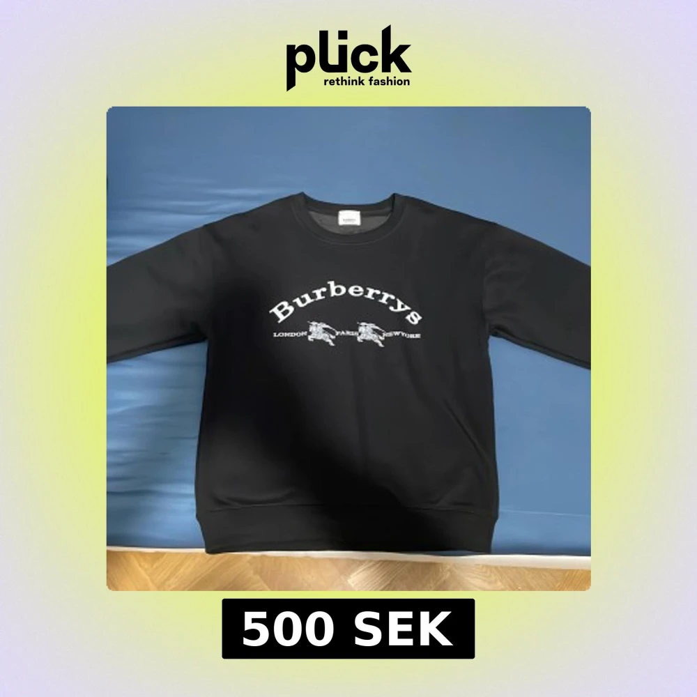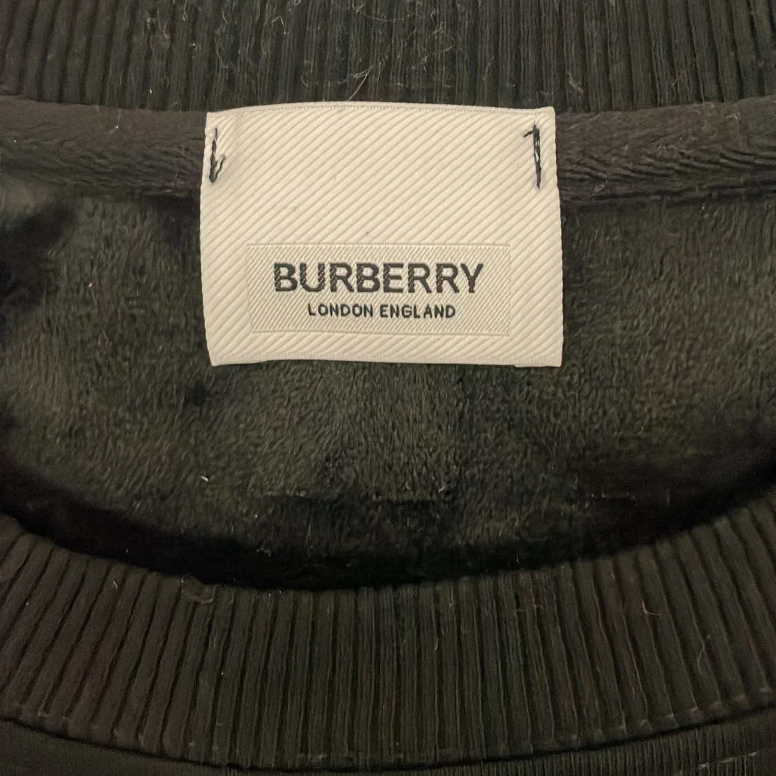 Svart sweatshirt från Burberry med klassisk rund hals och tryck i vitt framtill med texten 'Burberrys' och motiv. Tröjan har långa ärmar och ribbade muddar vid ärmslut och nederkant. Perfekt för en stilren och trendig look.. Kan gå ner i pris