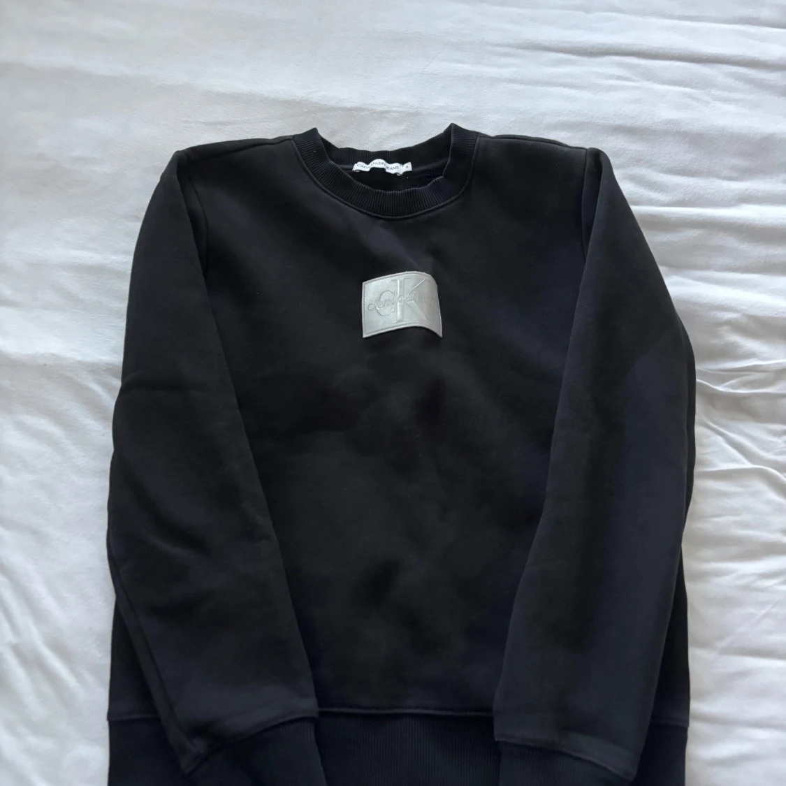 Svart sweatshirt från Calvin Klein Jeans med en silverfärgad CK-logga på bröstet. Tröjan har rund halsringning, långa ärmar och ribbade muddar. Perfekt för en clean och stilren look.