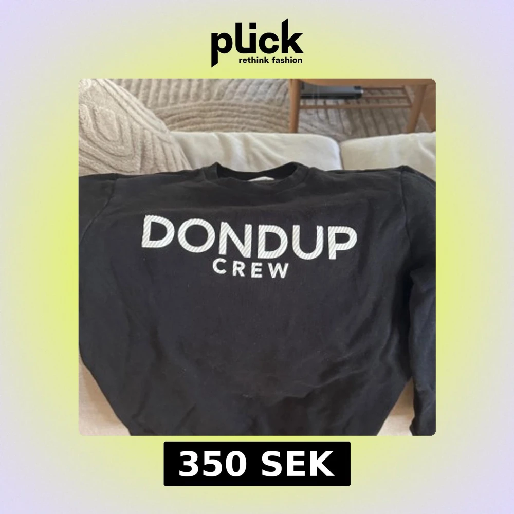 Säljer en svart sweatshirt från Dondup med vit text 'DONDUP CREW' på bröstet. Tröjan har rund hals och långa ärmar, perfekt för en avslappnad stil. Passar dig som gillar klassiska och stilrena plagg. Storlek liknar M
