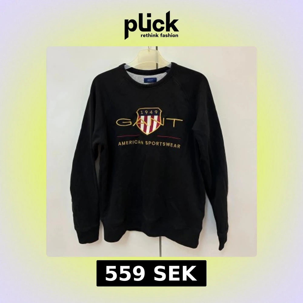 Svart sweatshirt från GANT med broderad logga och sköld på bröstet. Klassisk rund halsringning och långa ärmar. Snygg kontrast med gult och rött broderi. Sitter som storlek S/XS. Köpt för 799kr.