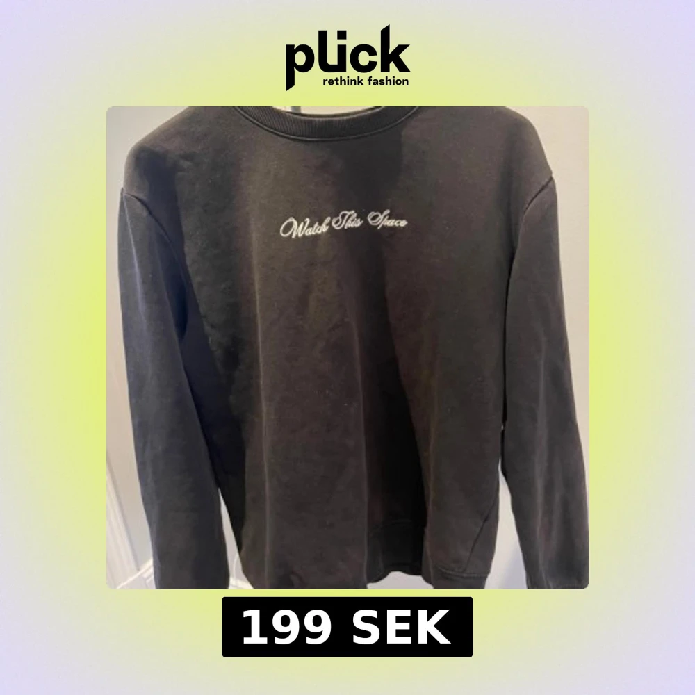 Säljer en svart sweatshirt från H&M med texten 'Watch This Space' och 'The City That Never Sleeps' i vitt och rött på baksidan. Tröjan har långa ärmar och en rund halsringning. Perfekt för en casual look!
