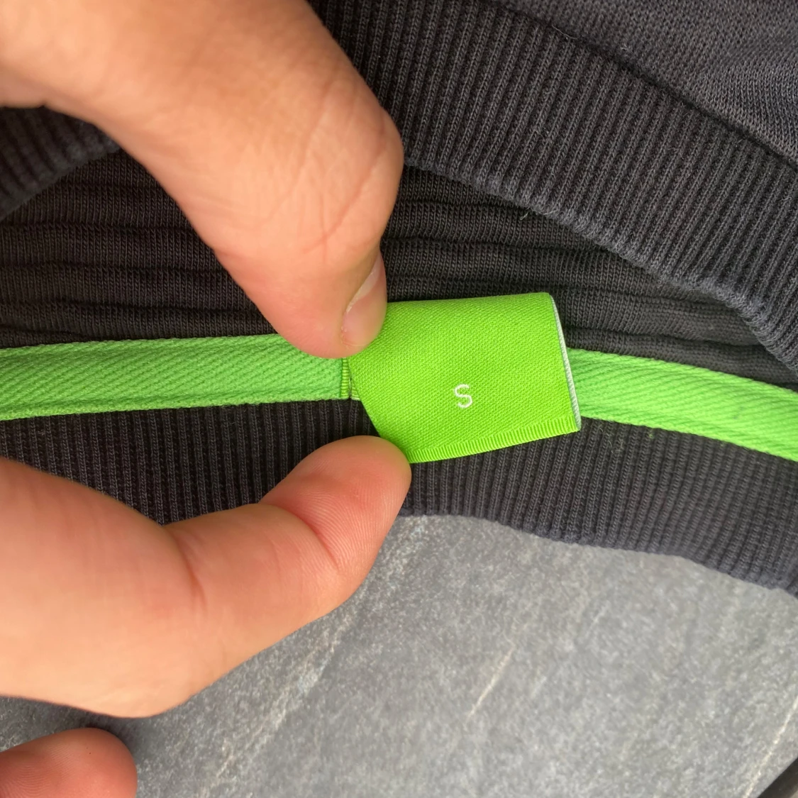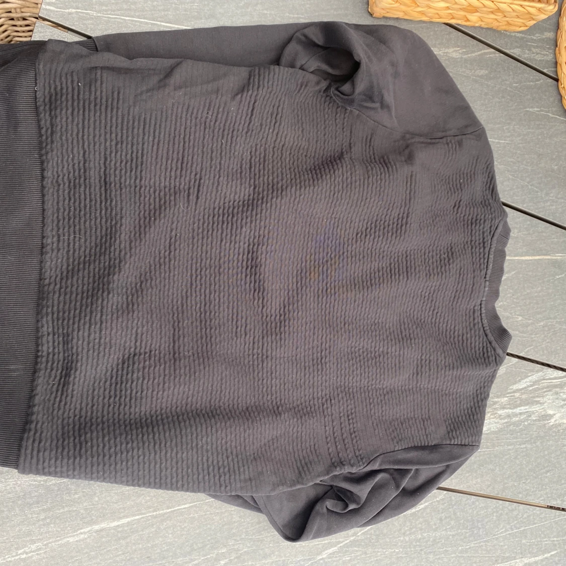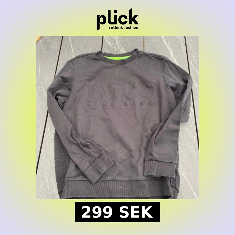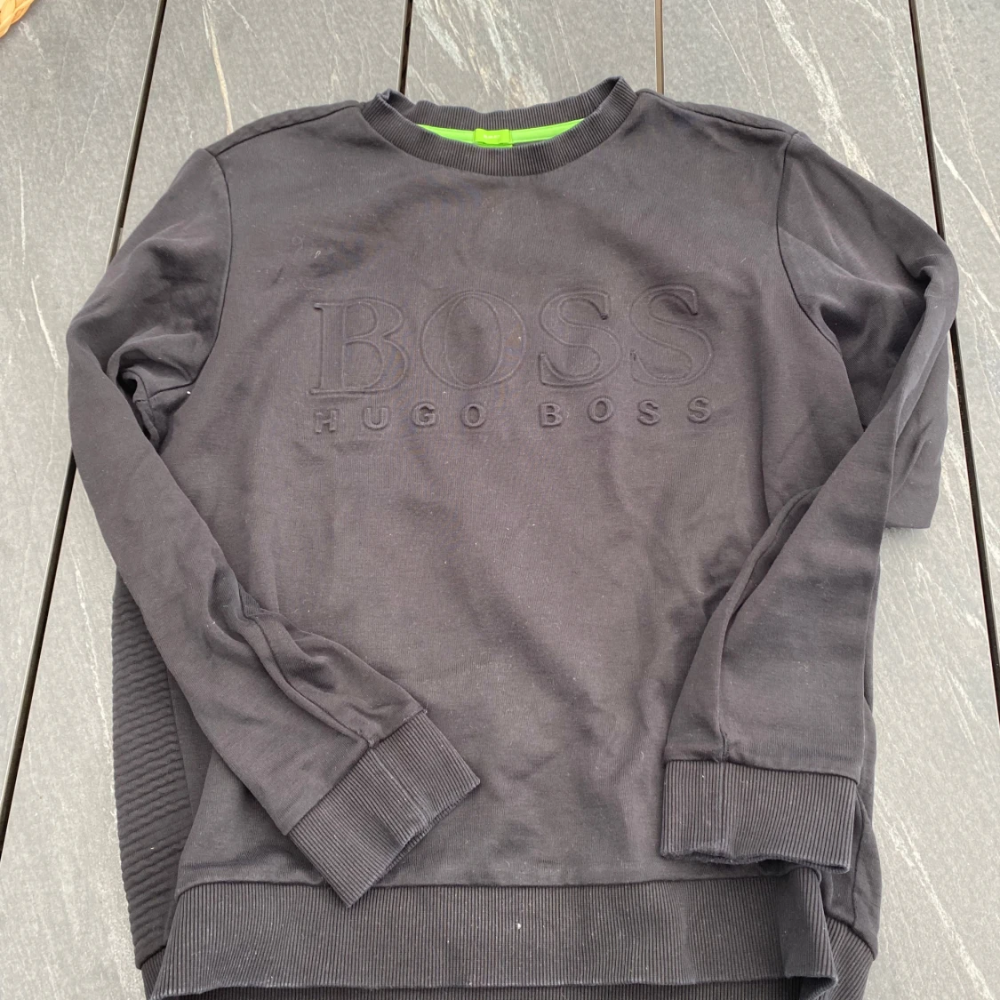 Säljer en svart sweatshirt från Hugo Boss med diskret broderad logga framtill. Tröjan har rund halsringning, ribbade muddar och en strukturerad baksida. Slim fit-modell med snygga detaljer och klassisk stil.