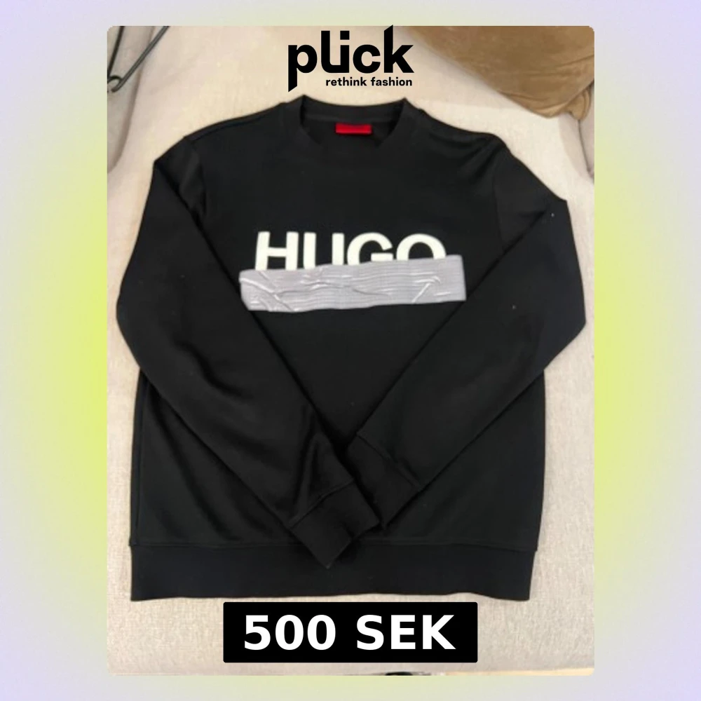 Säljer en svart sweatshirt från HUGO med stor vit logga framtill och en grå detalj över bröstet. Tröjan har rund halsringning och långa ärmar. Perfekt för dig som gillar stilrena och trendiga plagg med en twist.