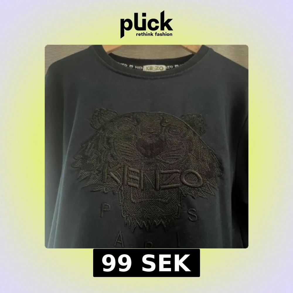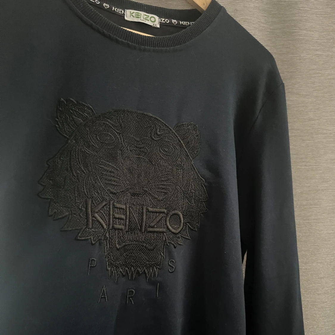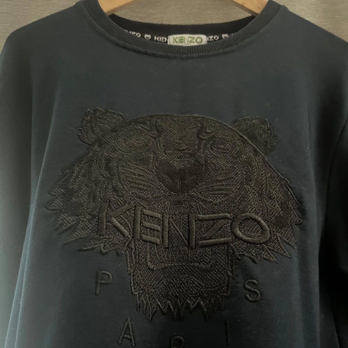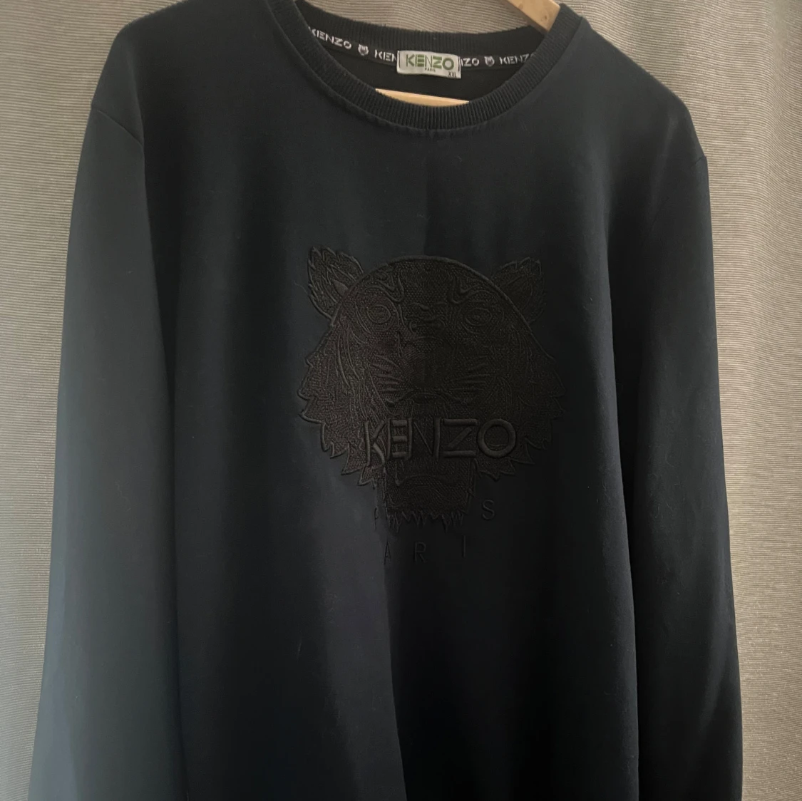 Strl xxl men sitter som L Snygg svart sweatshirt från Kenzo med ett broderat tigerhuvud och logotyp på framsidan. Tröjan har långa ärmar och en rund halsringning. Perfekt för en stilren look.