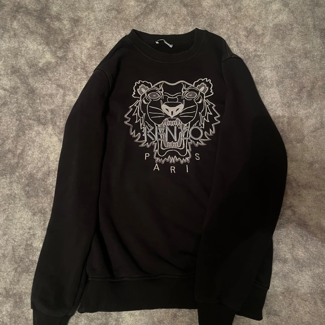 Säljer en svart sweatshirt från Kenzo med ett stort broderat tigerhuvud och texten 'Kenzo Paris' på framsidan. Tröjan har långa ärmar och ribbade muddar vid ärmslut och nederkant. Perfekt för en stilren look.