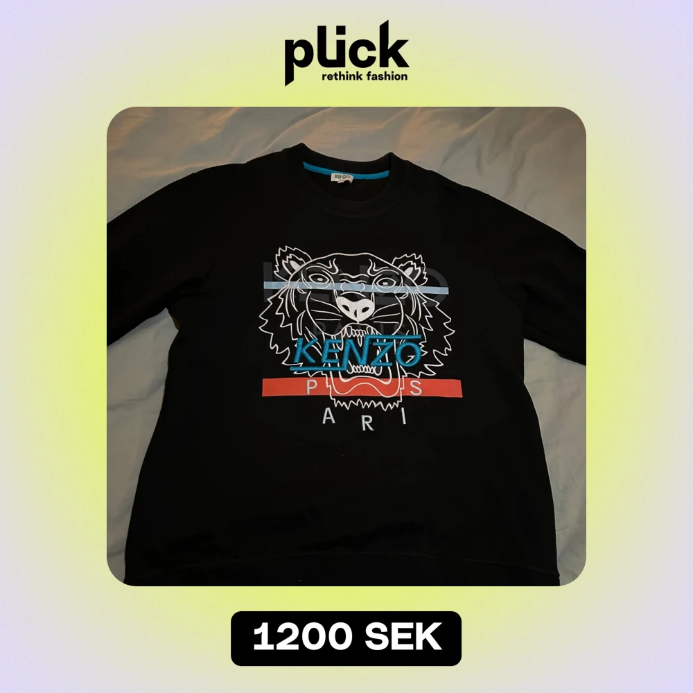 Säljer en svart sweatshirt från Kenzo med ett coolt tigertryck och texten 'Kenzo Paris' i blått och rött. Tröjan är i bra skick och perfekt för både vardag och fest. Den har långa ärmar och en normal passform. Passar perfekt för en avslappnad men uppklädd look.
