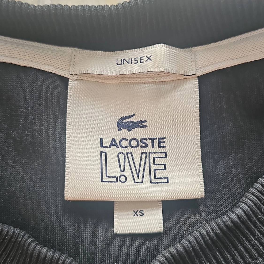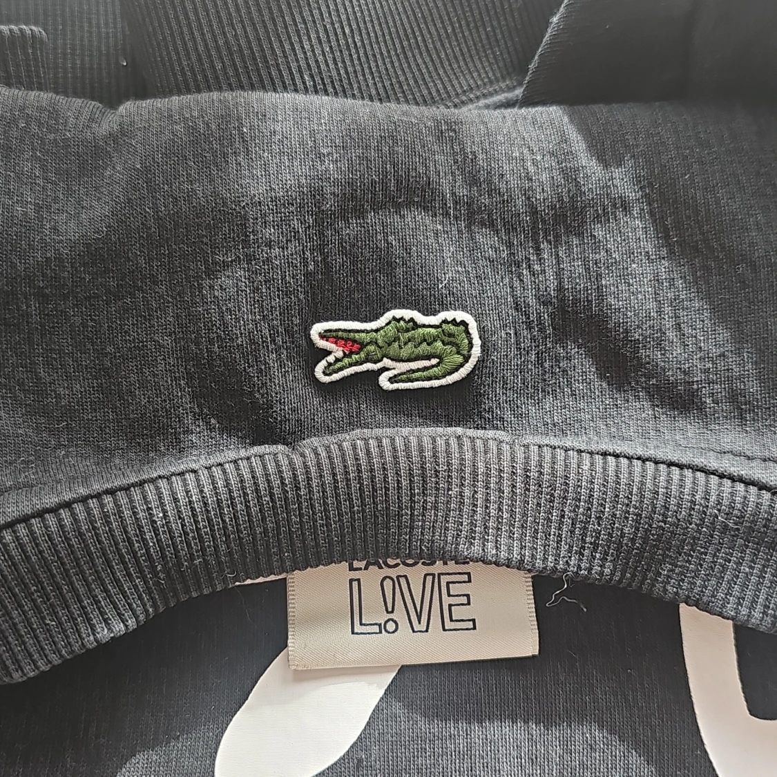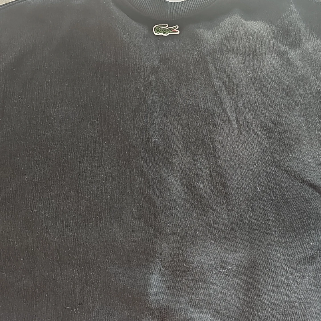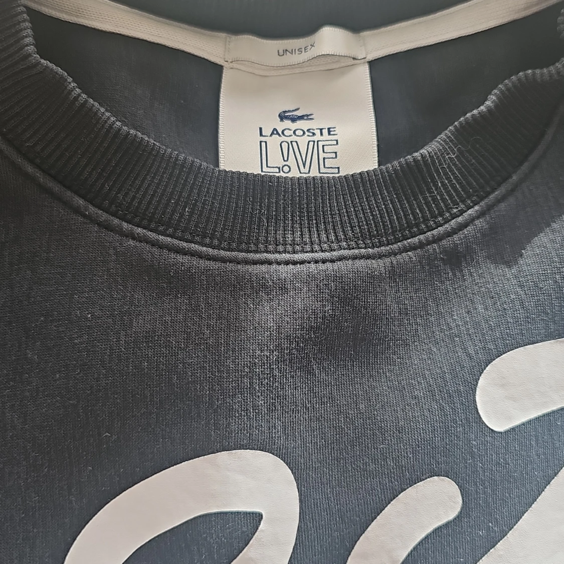 Säljer en svart sweatshirt från Lacoste Live med stor vit logotyp på framsidan. Tröjan är unisex och har en klassisk rund halsringning. Den ikoniska Lacoste-krokodilen är broderad på baksidan av kragen. Perfekt för en stilren och avslappnad look.