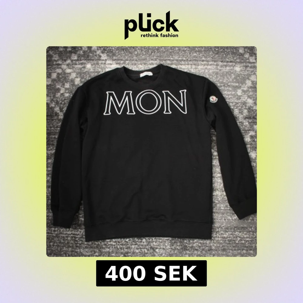 Säljer en svart sweatshirt från Moncler med stora vita bokstäver 'MON' på framsidan och 'CLER' på baksidan. Tröjan har rund halsringning och Moncler-logga på ärmen. Perfekt för en stilren och sportig look.