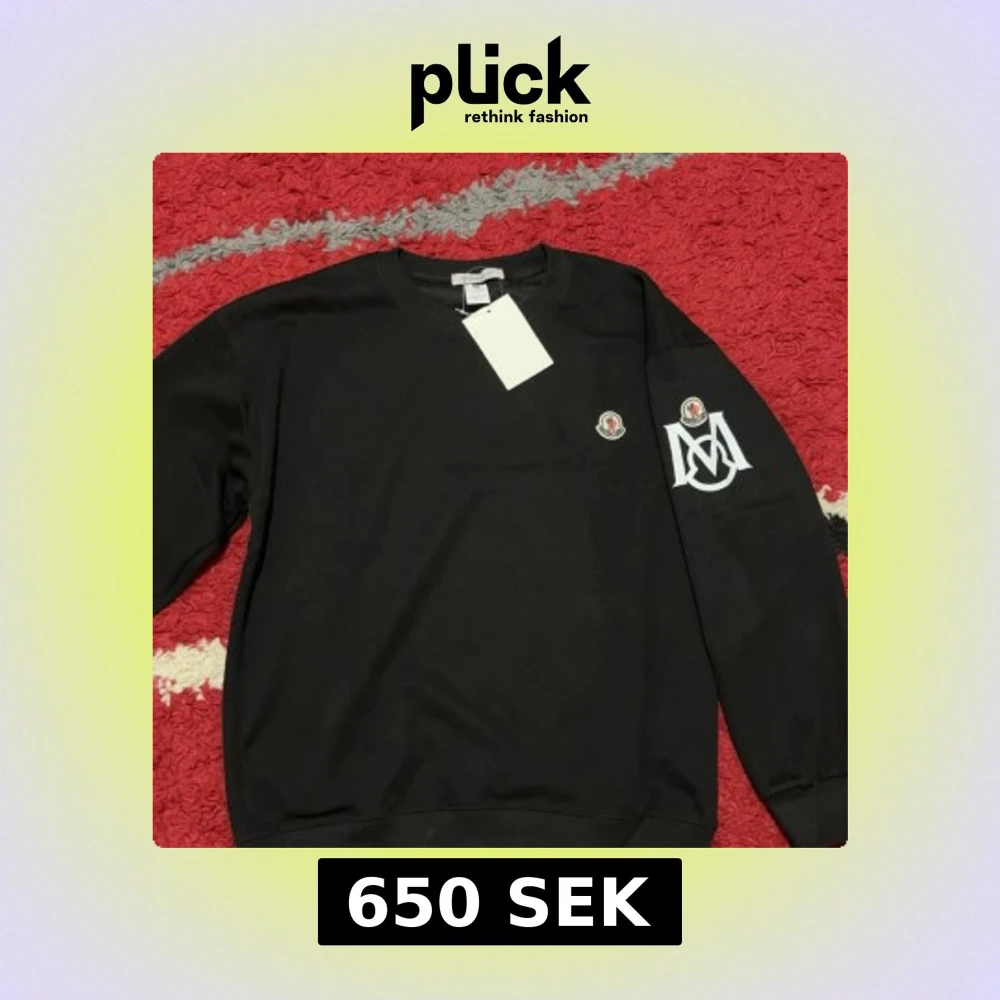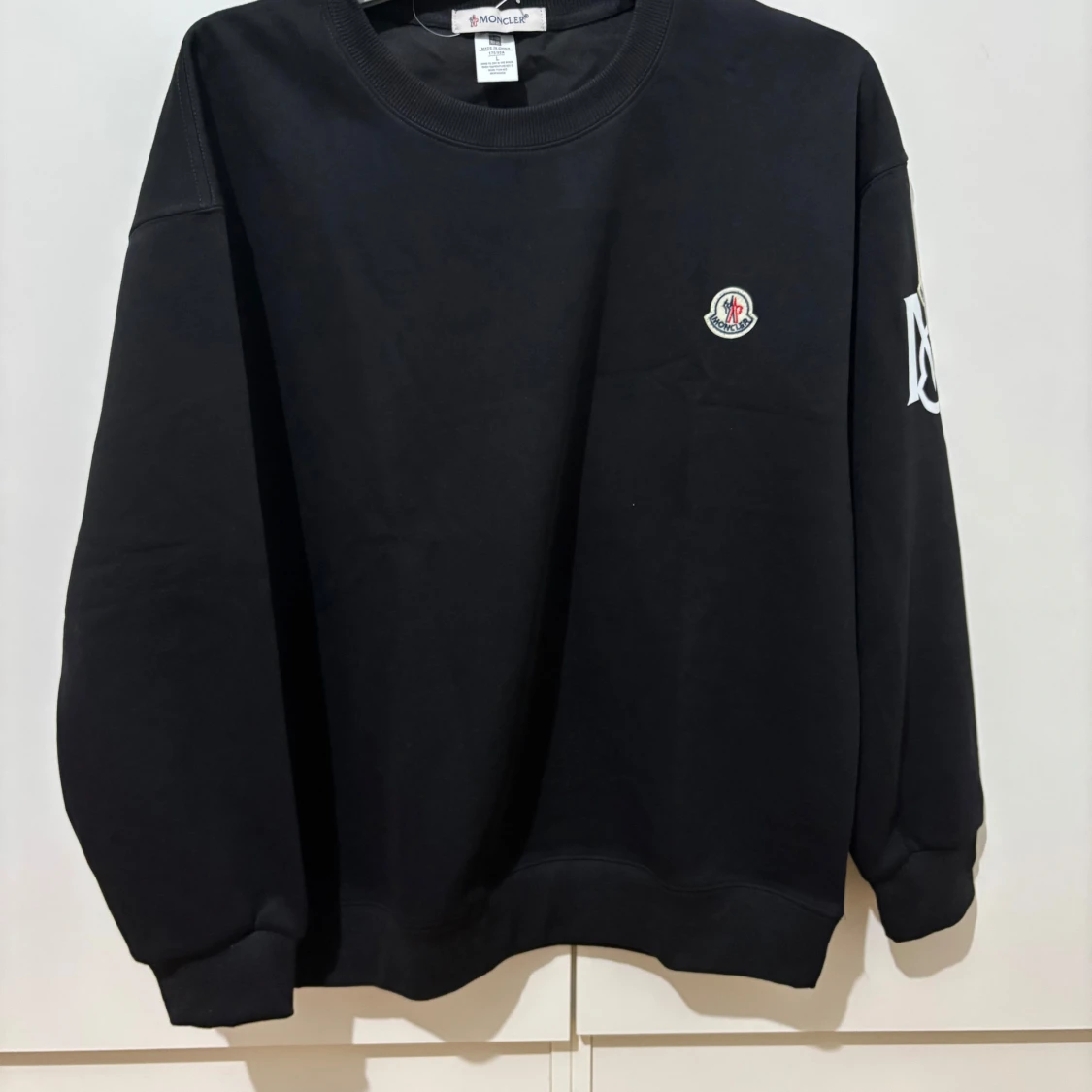 Svart sweatshirt från Moncler med rund hals och lång ärm. Tröjan har Moncler-logga på bröstet och ett stort vitt M-tryck på ena ärmen. Tillverkad i mjuk bomull, perfekt för chill dagar. Klassisk och stilren design med ribbade muddar.