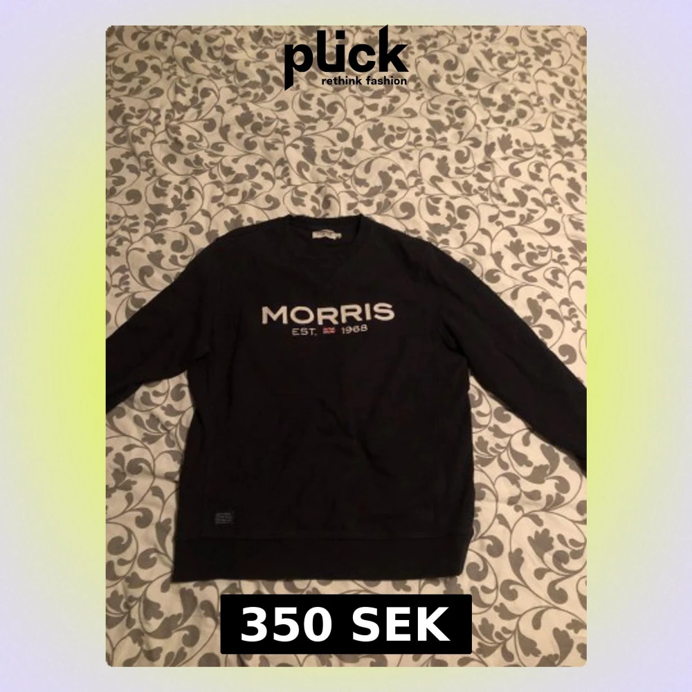 Svart sweatshirt från Morris i storlek M med vit broderad logga och texten 'MORRIS EST. 1968' på bröstet. Tröjan har rund hals, ribbade muddar och långa ärmar. Materialet är mjuk bomull som känns skön mot huden. Fler bilder kan lösas bara att höra av sig och pris kan diskuteras vid snabb affär.