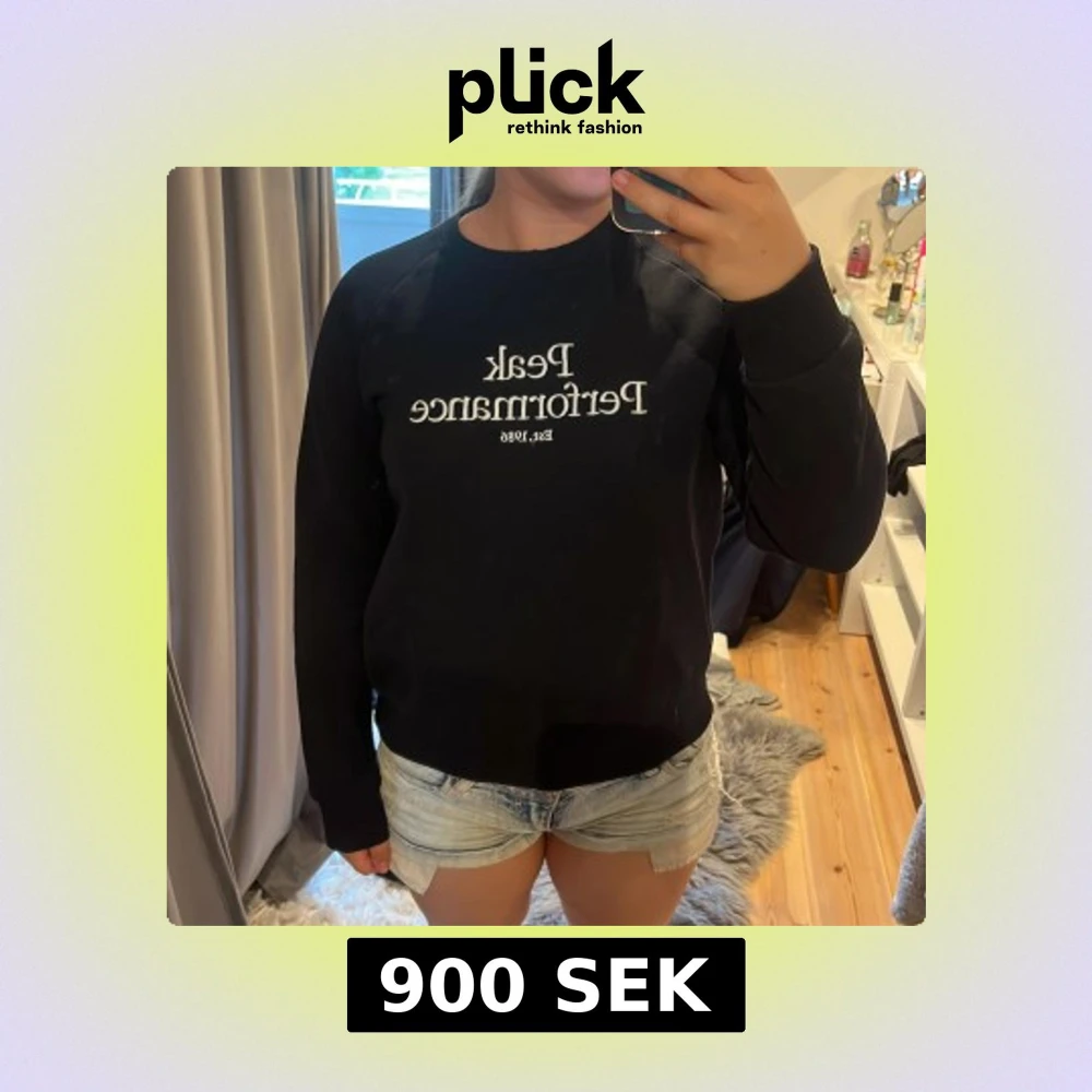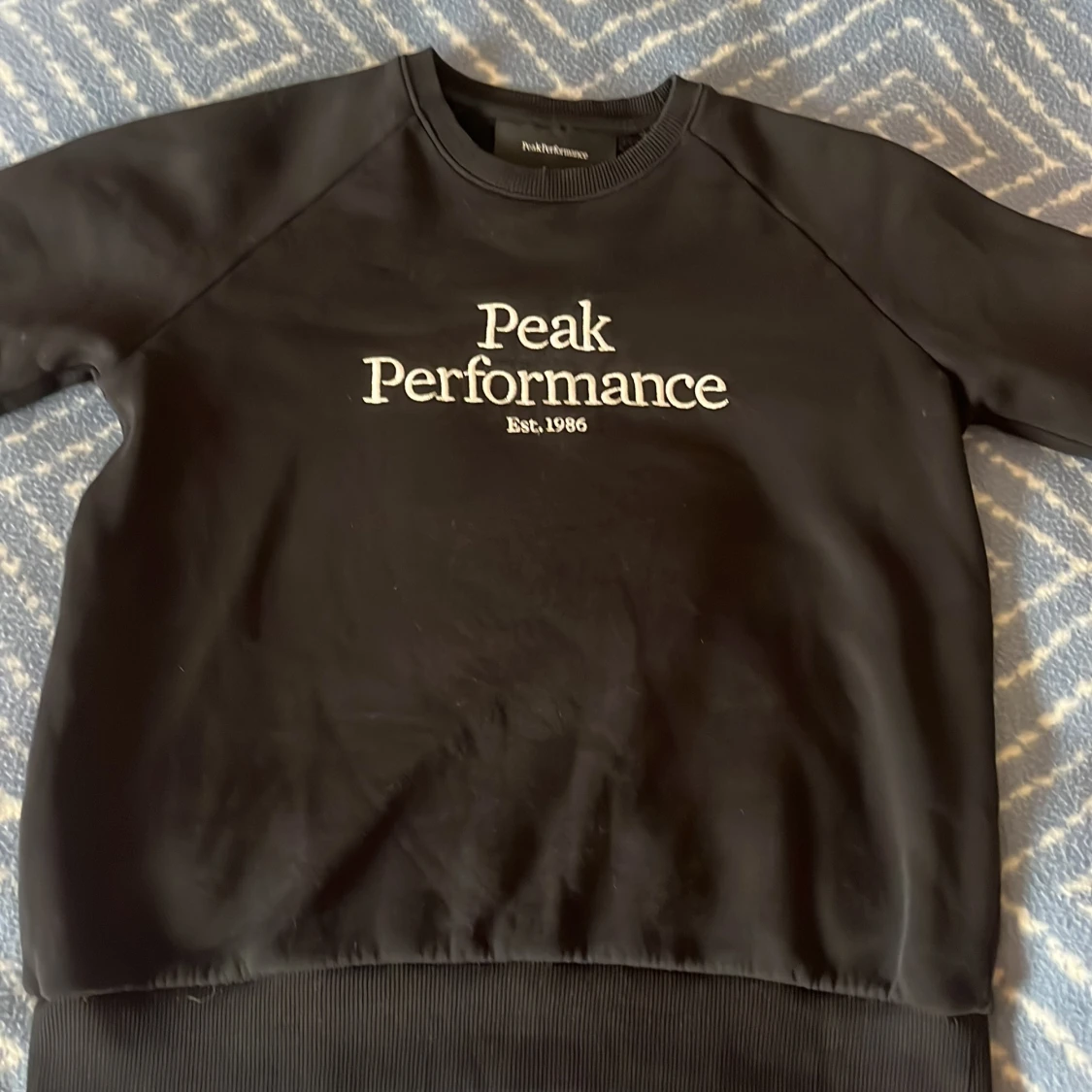 Svart sweatshirt från Peak Performance med vit broderad logga och text 'Est. 1986' på bröstet. Tröjan har rund hals, långa ärmar och ribbade muddar vid ärmslut och nederkant. Perfekt för chill dagar och enkel att matcha med jeans eller shorts.
