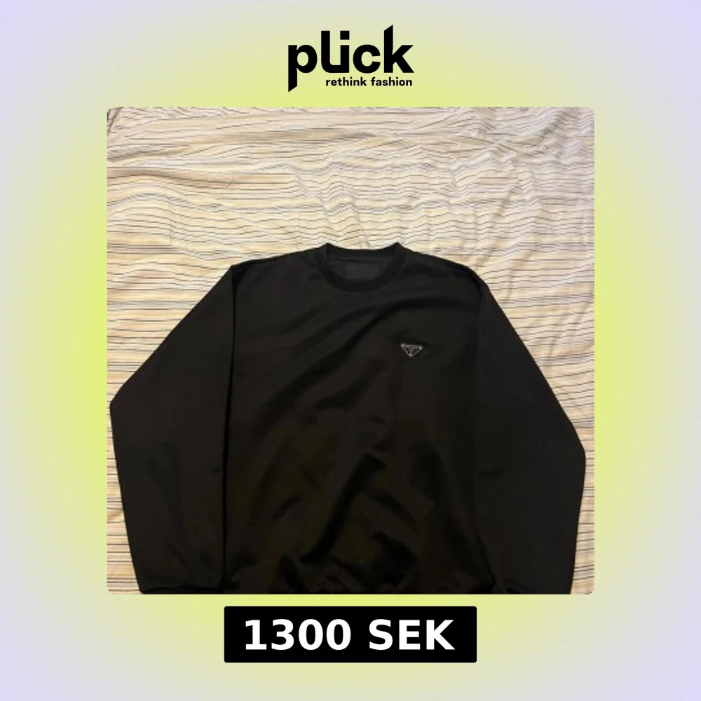 Svart långärmad sweatshirt från Prada med rund hals och ikonisk metalltriangel-logga på bröstet. Tröjan har en clean och stilren look med ribbade muddar vid hals och ärmslut. Materialet är mjukt och har en lätt glansig finish, vilket ger en lyxig känsla.