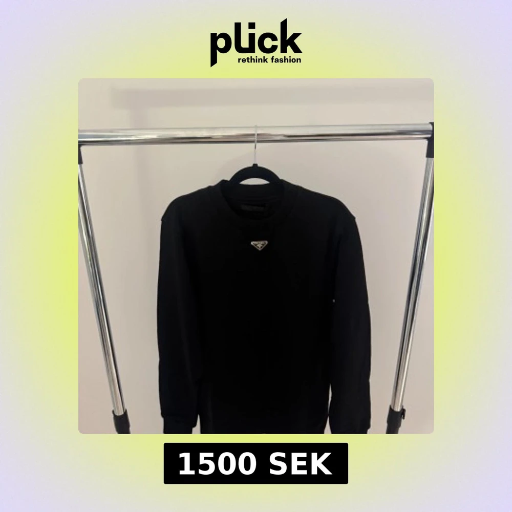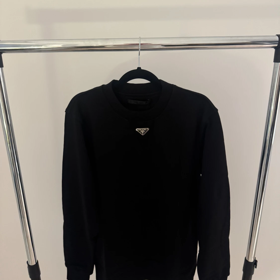 Stilren svart sweatshirt från Prada med klassisk rund halsringning och diskret logga i metall framtill. Tröjan har långa ärmar och en enkel, clean look som passar perfekt till streetwear eller en mer dressad stil.