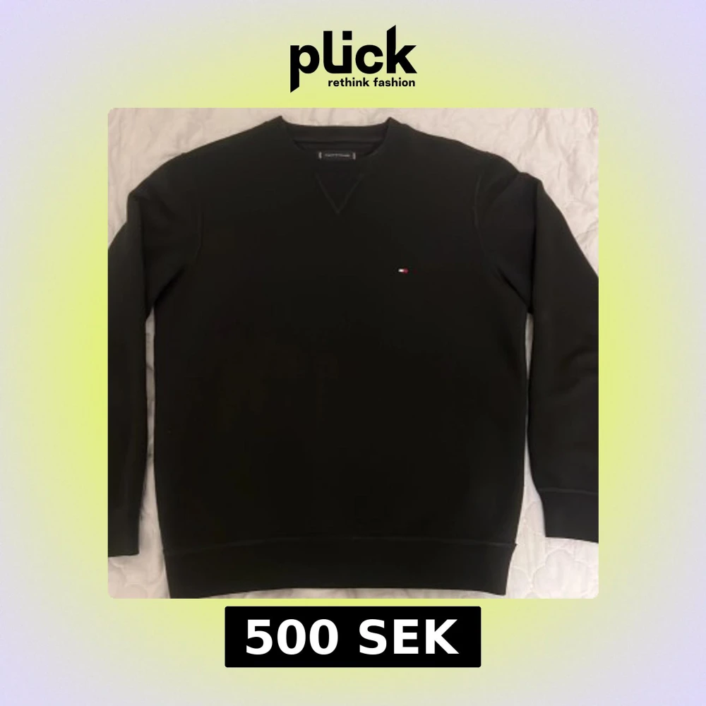 Svart sweatshirt från Tommy Hilfiger med liten broderad logga på bröstet. Tröjan har rund hals, ribbade muddar och lång ärm. Materialet är mjuk bomull med inslag av polyester, perfekt för chill dagar. Enkel och stilren design som funkar till jeans eller joggers. Jag säljer den för att den inte passar min klädsel och den är bara använd nån gång. Den passar även M då den är lite större i storleken. Ny pris är 1200