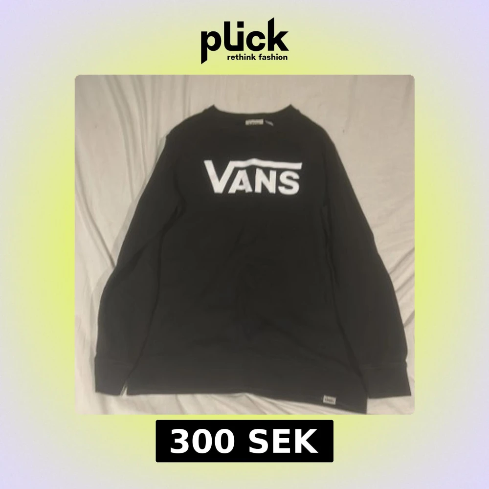 Svart sweatshirt från Vans med stort vitt logotryck på bröstet. Klassisk rund halsringning och långa ärmar. Mjuk insida och ribbade muddar vid ärmslut och nederkant. Perfekt för en avslappnad streetstyle-look.