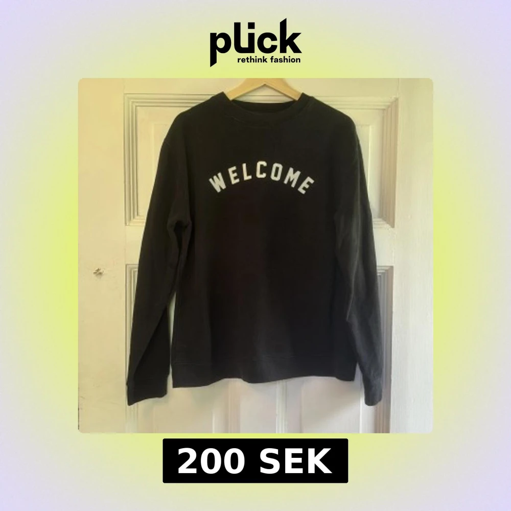 Svart sweatshirt från Welcome med vit text 'WELCOME' tryckt på bröstet och en vit patch med grafiskt motiv på ryggen. Tröjan har rund hals, långa ärmar och är gjord i mjuk bomull. Perfekt för dig som gillar streetwear och enkel stil.