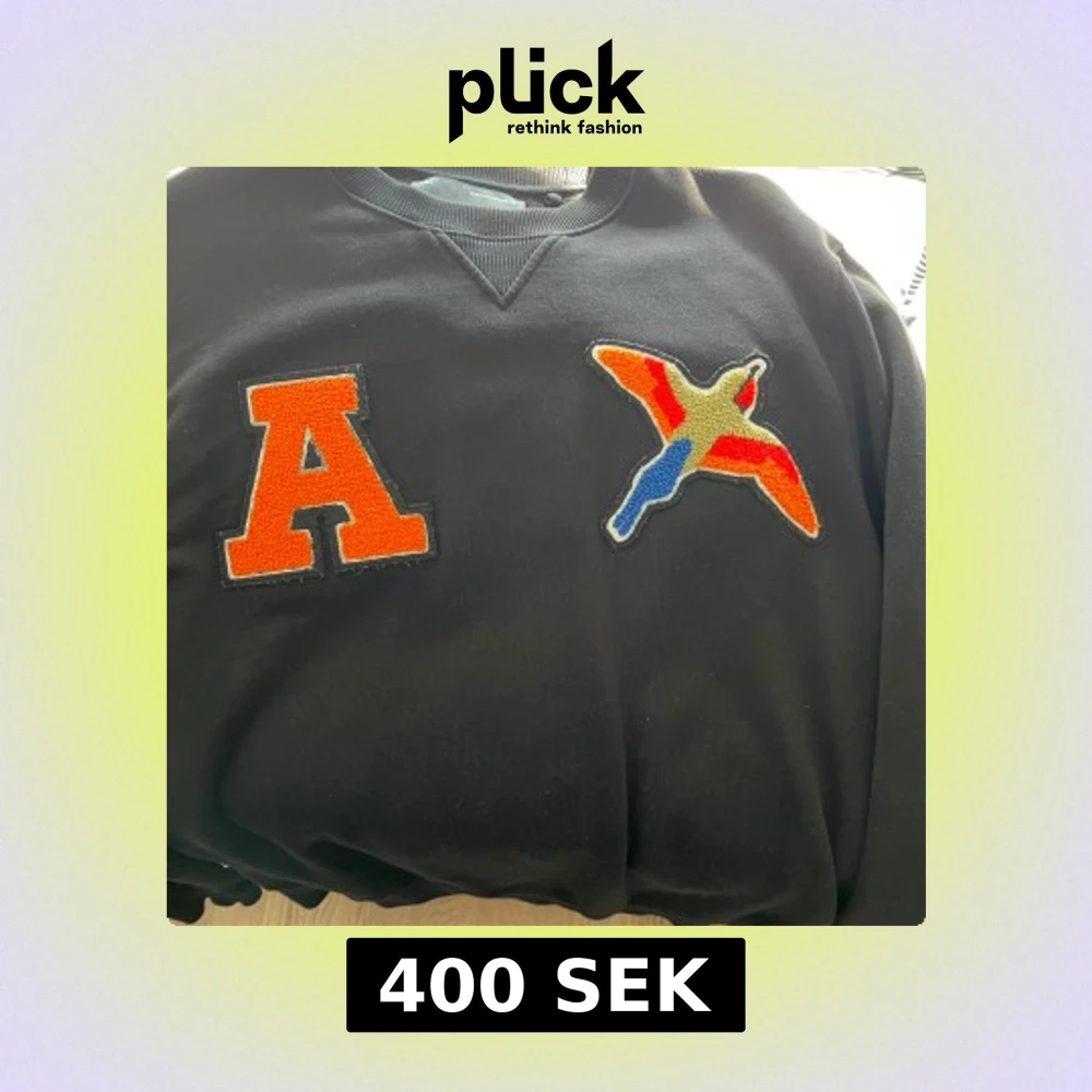 Säljer en svart sweatshirt från Axel Arigato med en stor orange bokstav 'A' och en färgglad fågelapplikation på bröstet. Tröjan har rund halsringning och ribbade muddar. Perfekt för dig som gillar streetwear och unika detaljer.