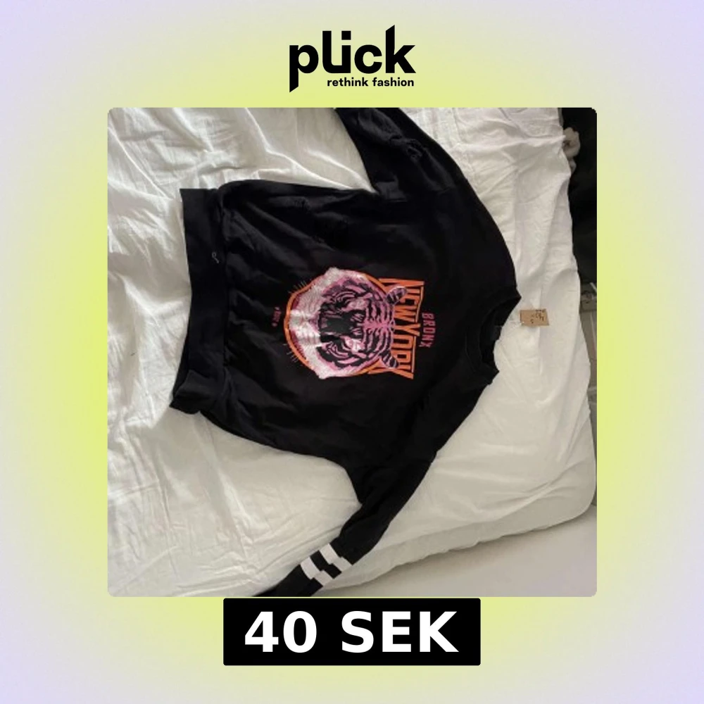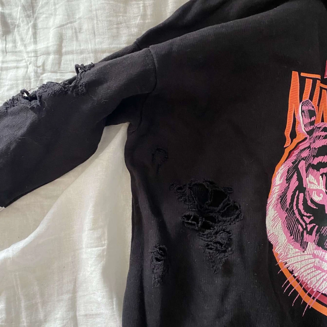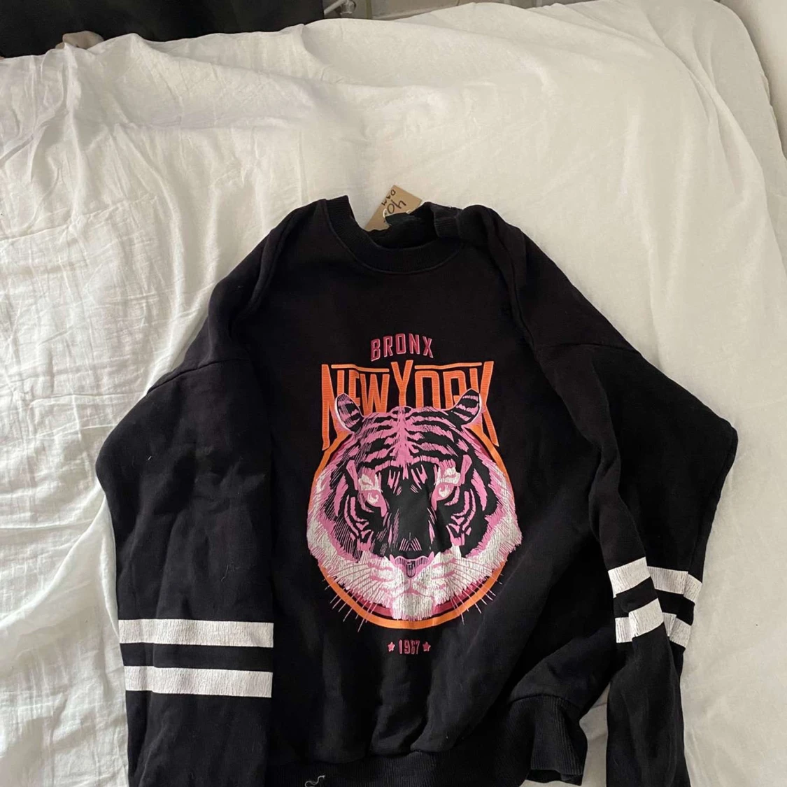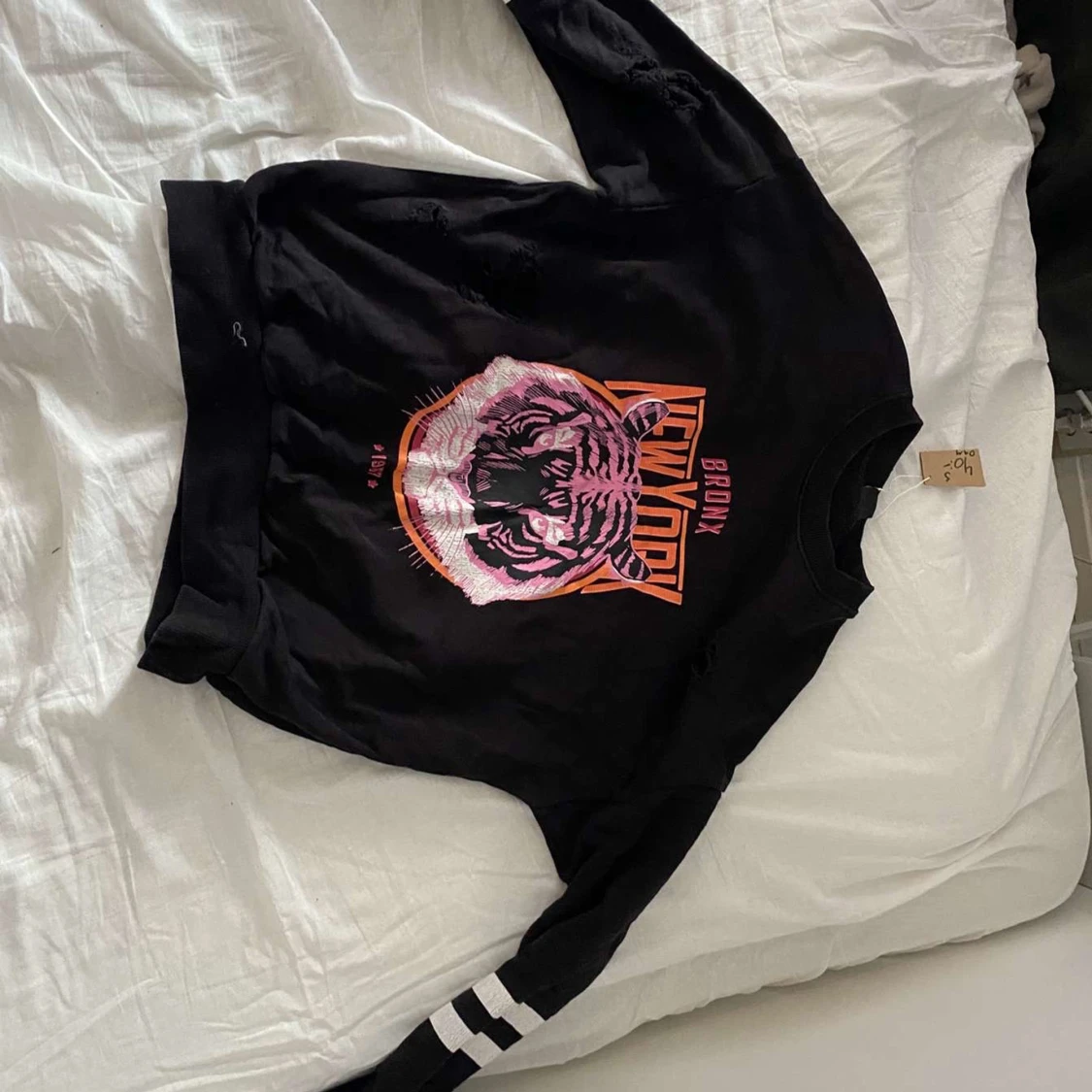 Cool svart sweatshirt från Gina Tricot med stort tigertryck i rosa och orange samt texten 'Bronx New York'. Tröjan har vita ränder på ärmarna och slitna detaljer för en edgy look. Perfekt för dig som gillar streetstyle. Obs! hålen är design