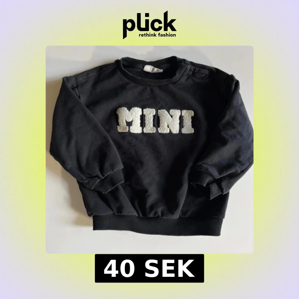 Svart sweatshirt från Kappahl med stora vita bokstäver i teddy-material som stavar 'MINI' på bröstet. Tröjan har ribbade muddar vid ärmslut och midja samt knappar på axeln för enkel påklädning. Perfekt för en cool och bekväm vardagslook.