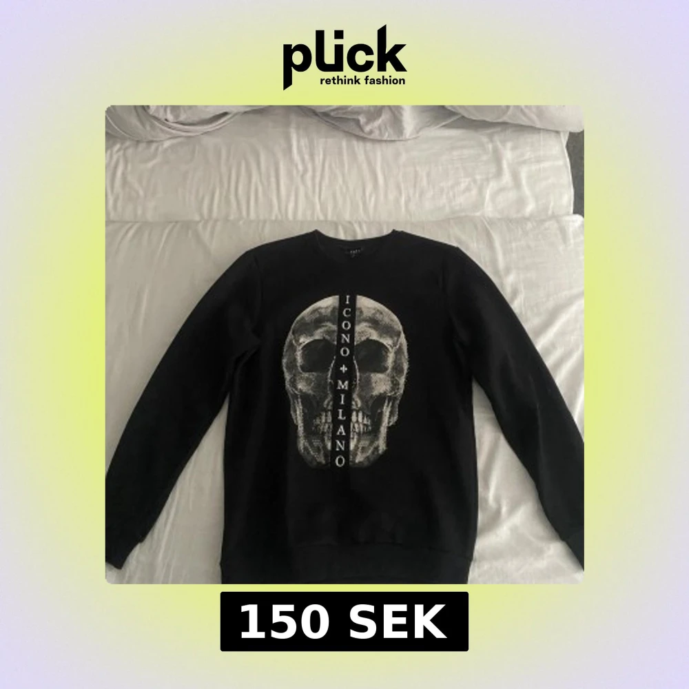 Svart sweatshirt från SMDG i regular fit med stort döskalletryck framtill och texten 'ICONO MILANO' i mitten. Knappt använd