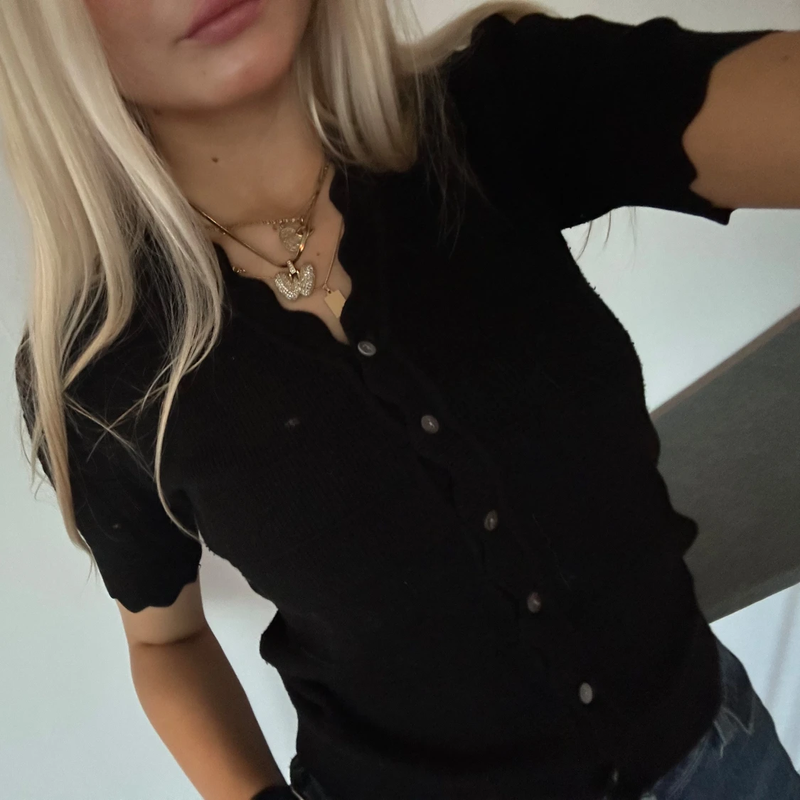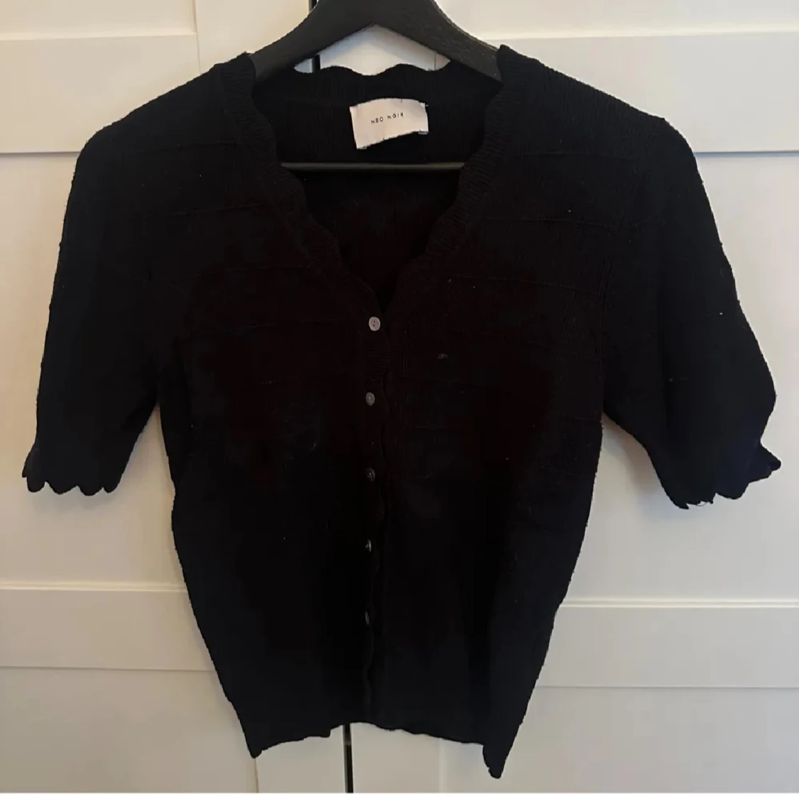 Svart stickad t-shirt från Neo Noir🖤Så fin och basic men ändå lite extra med ”volang” på armarna och vid kragen. Perfekt till vardags🩶🩶🩶