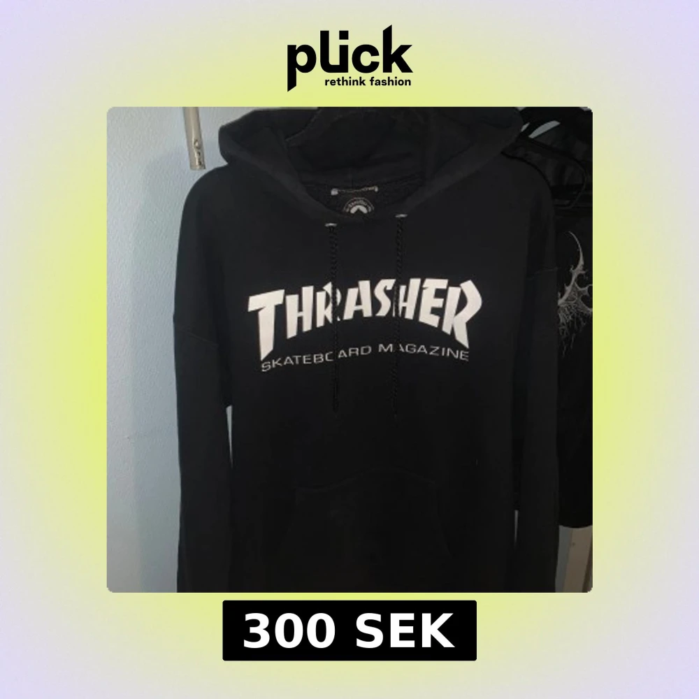 Svart hoodie från Thrasher med klassiskt vitt logotryck på bröstet. Tröjan har huva med snörning och en stor magficka. Perfekt för dig som gillar streetwear och skatekänsla.storlek m