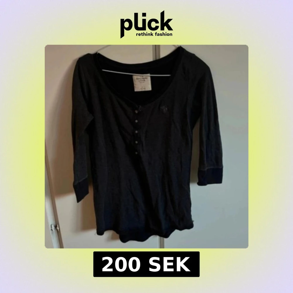 Svart topp från Abercrombie & Fitch med trekvartsärm och rund halsringning. Framsidan har en knappslå med små knappar och en diskret broderad logga på bröstet. Perfekt för en chill och stilren look.