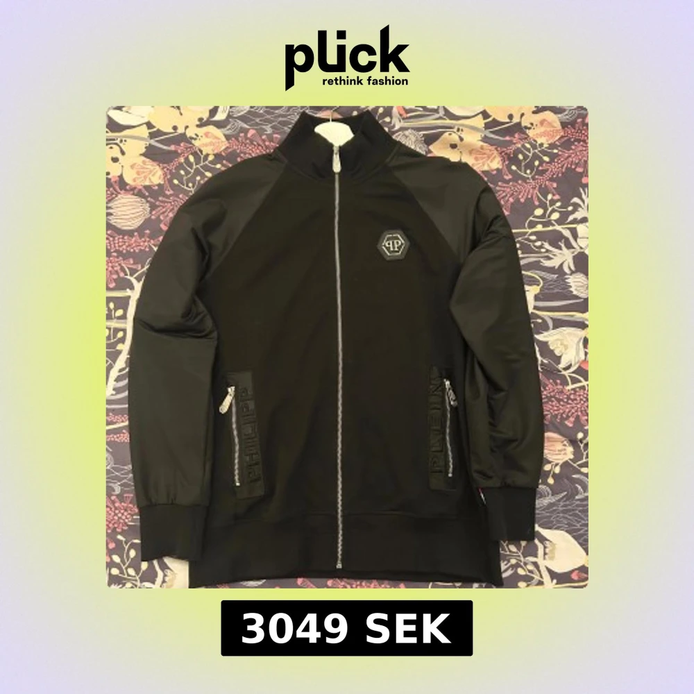 Svart tracksuit från Philipp Plein med hel dragkedja, ribbade muddar och två fickor med dragkedja. Tröjan har ett stort tryck av en dödskalle på ryggen och logotyp på bröstet. Snygga detaljer och sportig känsla.