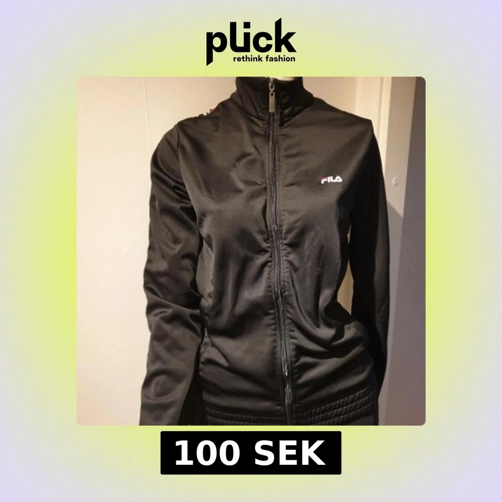 Snygg svart träningsjacka från Fila med dragkedja och logotyp på bröstet. Jackan har långa ärmar med Fila-tryck längs sidorna. Perfekt för en sportig look!