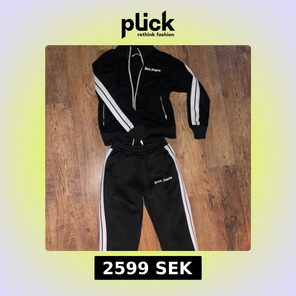 Snyggt svart träningsset från Palm Angels med vita ränder längs ärmar och ben. Jackan har dragkedja och två fickor med vita detaljer. Perfekt för en sportig look eller avslappnad stil. Storlek i M och den är mycket sparsamt använd🖤
